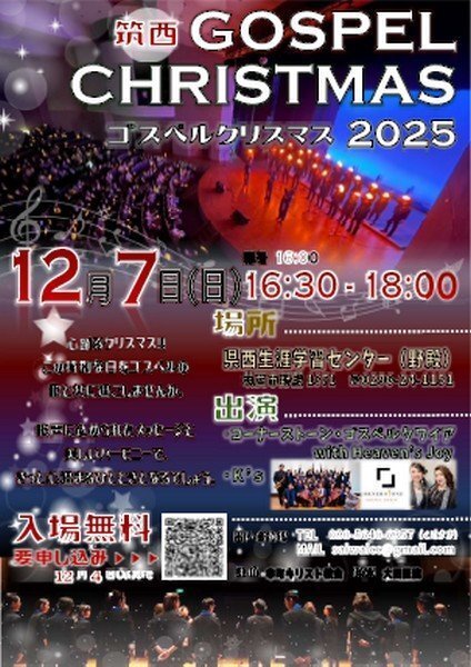 12/7(日)16時半~ 筑西GOSPEL CHRISTMAS 2025 @ 茨城県筑西市 県西生涯学習センター 入場無料 12/4までに要申込 ibanavi.net/event/18211 #ゴスペル #ゴスペルコンサート #クリスマスコンサート pic.x.com/CS223znuZu