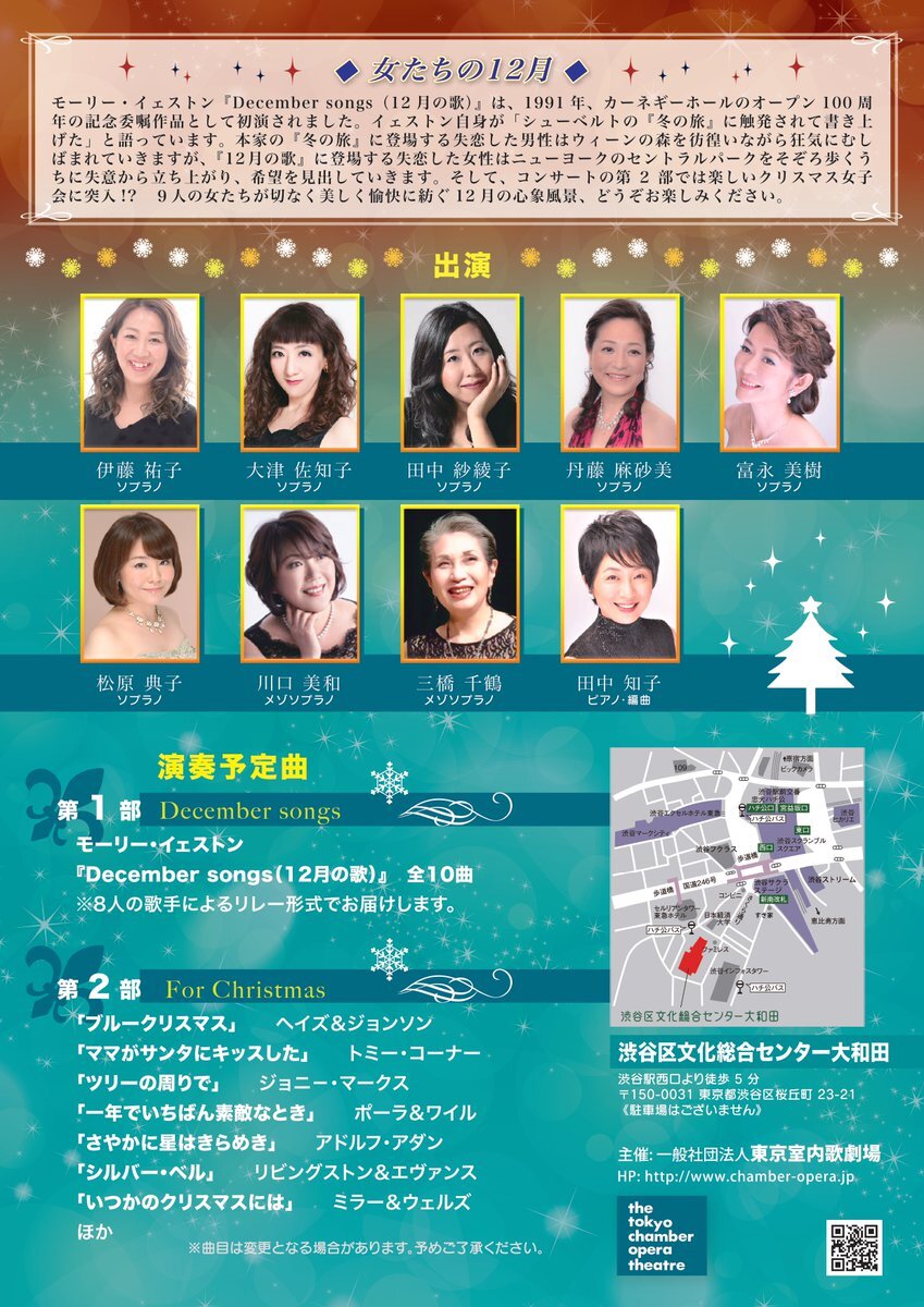 🎄アメリカン・ソングブック4 12/10(水)19:00開演 第1部:モーリー・イェストン『December songs』全10曲 第2部:クリスマスソング特集 8人の歌手が紡ぐ12月の心象風景 📍 伝承ホール 💰4,000円(全席自由) 詳細→ chamber-opera.com/de8466 #東京室内歌劇場 #クリスマスコンサート pic.x.com/2fSZUWgBi9