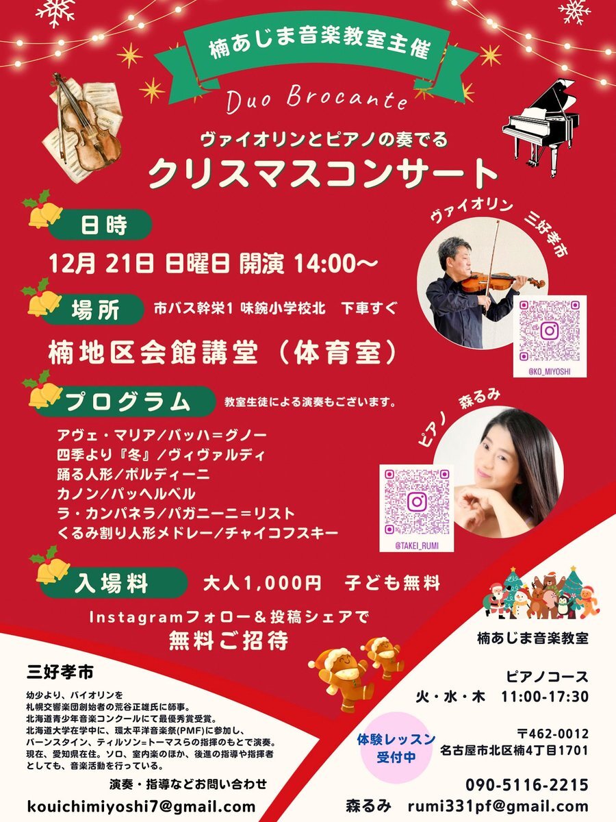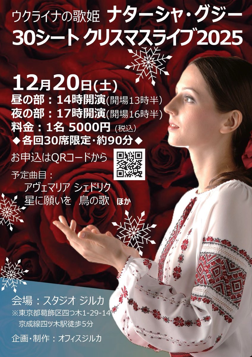 みなさま 今年最後の #30シートライブ は #クリスマスコンサート です! 東京都葛飾区 ノーマイクでの 歌と演奏をお楽しみください! 申し込みフォームから 演奏曲のリクエストもできますので ぜひお出かけください! 会場では #ウクライナの民族衣装 や #なっちゃんボルシチ の販売もあります! pic.x.com/5hWLbHqPME