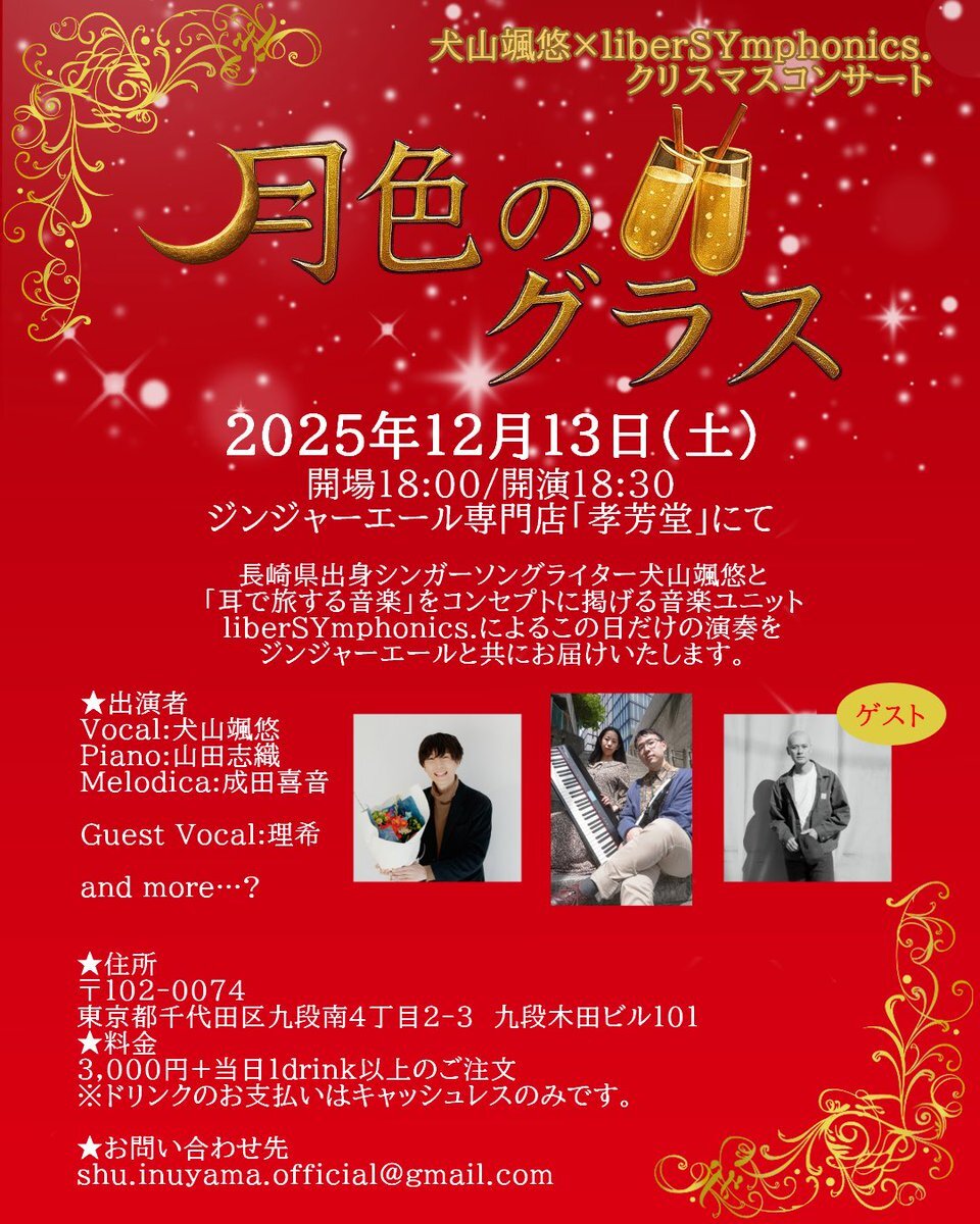 クリスマスコンサート「月色のグラス」にGuest Vocalとして理希さんの出演が決定しました! 理希さん、よろしくお願いいたします☺️ チケットは下記リンクよりまだご購入いただけます。 shu-inuyama-official.bitfan.id/events/13948 #クリスマスコンサート #月色のグラス #シンガーソングライター #音楽 pic.x.com/cihU5NroNm