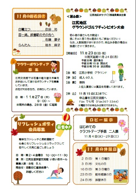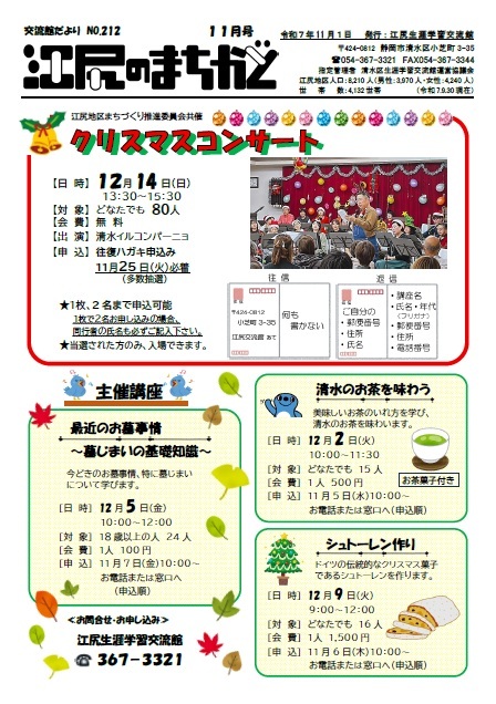 📢交流館だより『江尻のまちかど』11月号です✨ 講座やクリスマスコンサートのご案内など 季節感のある内容をお届けします🎄🔔 是非、ご覧ください😀 #江尻 #11月号 #館報 #クリスマスコンサート #清水のお茶 #シュトーレン #墓じまい pic.x.com/1QWX4qicgy