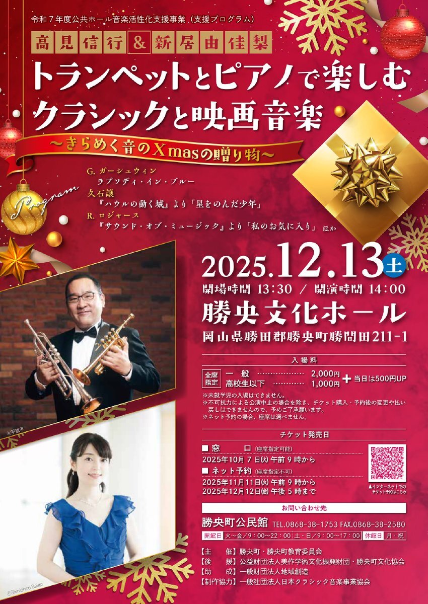12/13㊏ 「 #高見信行 & #新居由佳梨 #トランペット と #ピアノ で楽しむクラシックと #映画音楽 ~きらめく音のXmasの贈り物~」 トランペットとピアノの響きに包まれる特別なひとときをお届けします! 一足早い #クリスマスコンサート をお楽しみください😊 勝央町HP town.shoo.lg.jp/soshiki/28/634… pic.x.com/yrgP1F4gGH