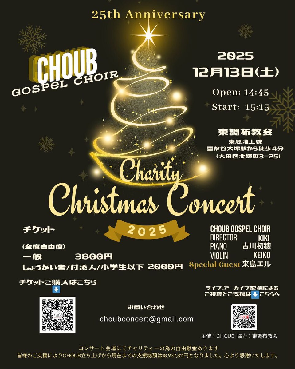 12/13(土)15:15~ CHOUB GOSPEL CHOIR 25th Anniversary Charity Christmas Concert @ 東京都大田区 東調布教会 出演:CHOUB GOSPEL CHOIR KIKI|古川初穂|KEIKO Special Guest:来島エル チケット:3,800円 他 passmarket.yahoo.co.jp/event/show/det… #ゴスペル #ゴスペルコンサート #クリスマスコンサート pic.x.com/ysjKFPGK9Z