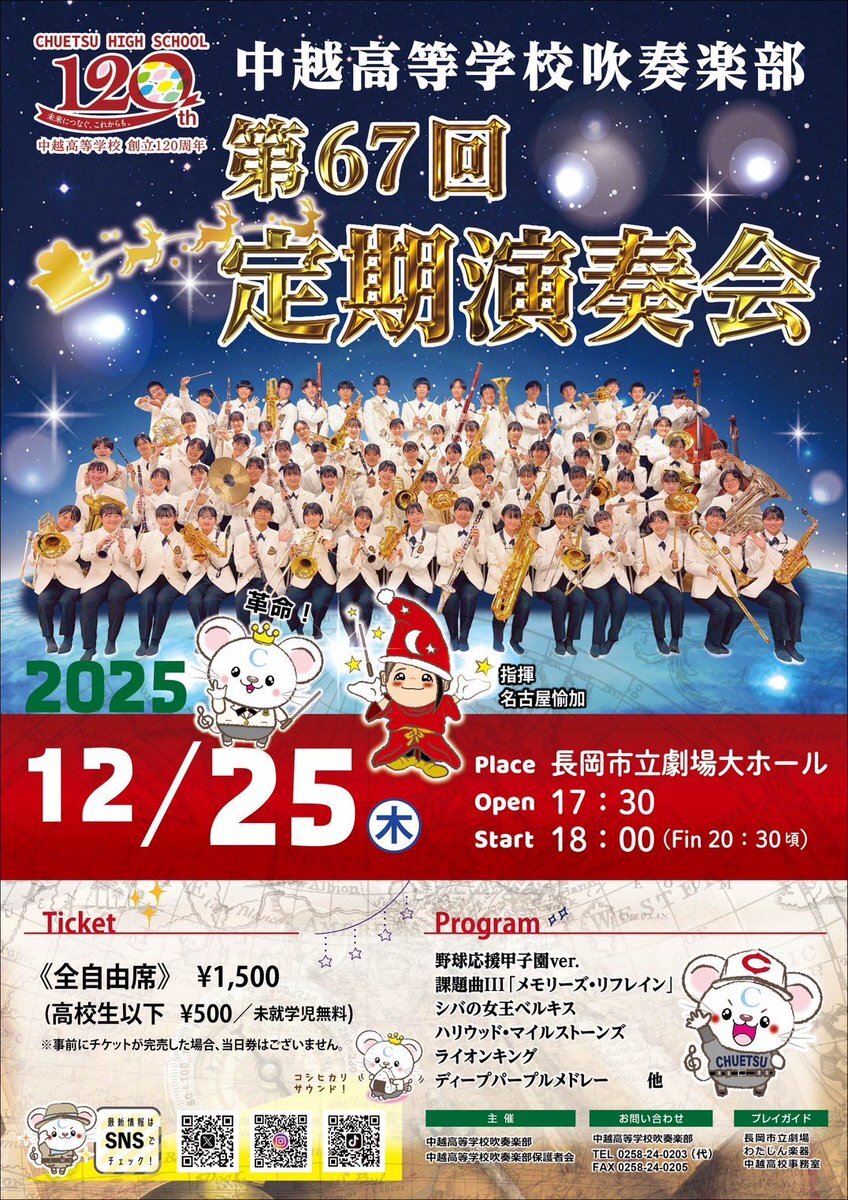 🎄 第67回定期演奏会 🎄 📅 12月25日(木) 🕠 17:30開場 / 18:00開演 🏛️ 長岡市立劇場 創立120年の歴史に響く、音の贈りもの🎁 クリスマスの夜、中越サウンドがあなたの心を包みます✨今年の集大成ぜひ会場でお聴きください🎶 #中越高校吹奏楽部 #定期演奏会 #吹奏楽 #クリスマスコンサート pic.x.com/ZLxf9gM6qD