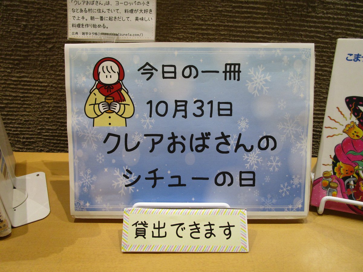 【今日の一冊📕】 今日は『クレアおばさんのシチューの日』です🥣 図書館ではシチューがでてくる絵本やレシピ本を多数展示しています📚 展示にない本もお探しできますので、お気軽にカウンターまでお伝えください😀 #音更町図書館今日の1冊 #クレアおばさんのシチューの日 #シチュー pic.x.com/imoTcNuar0