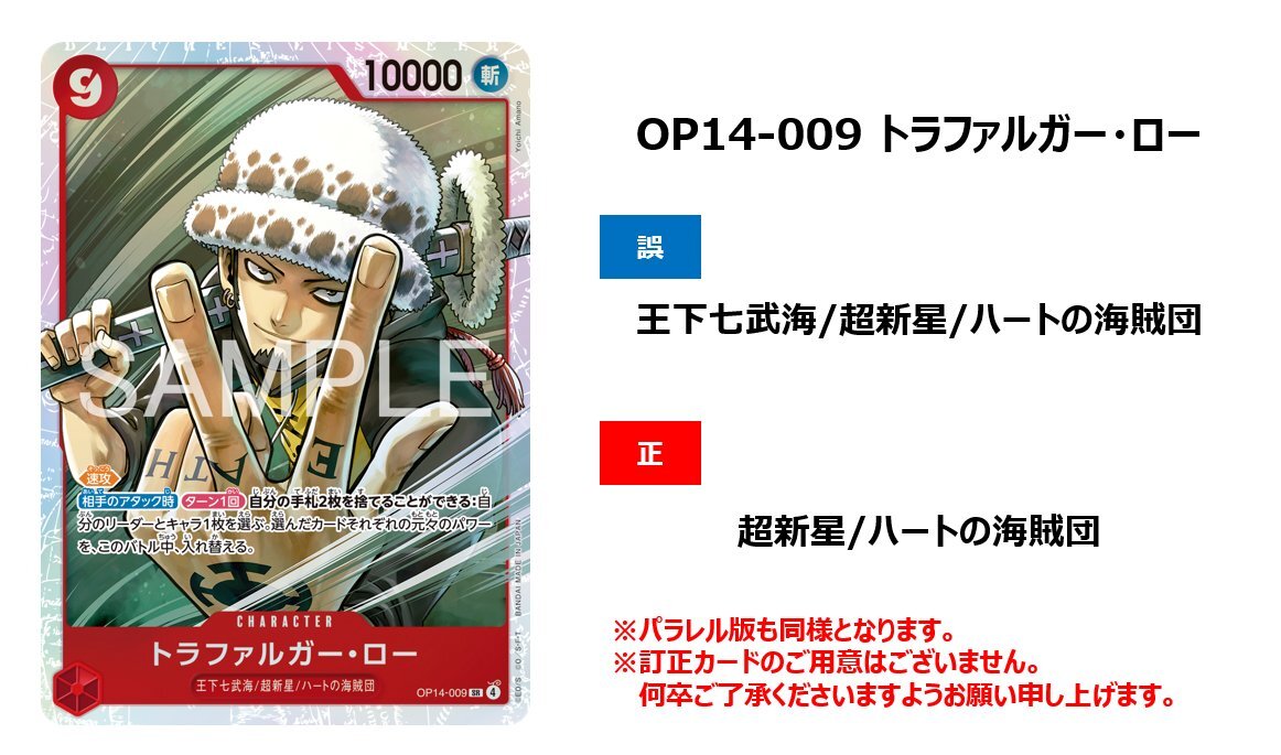 【訂正とお詫び】 11/22(土)発売のブースターパック『蒼海の七傑【OP-14】』に収録の「トラファルガー・ロー」について、特徴の誤表記がございましたので、エラッタを行います。 詳しくは、添付画像をご確認ください。