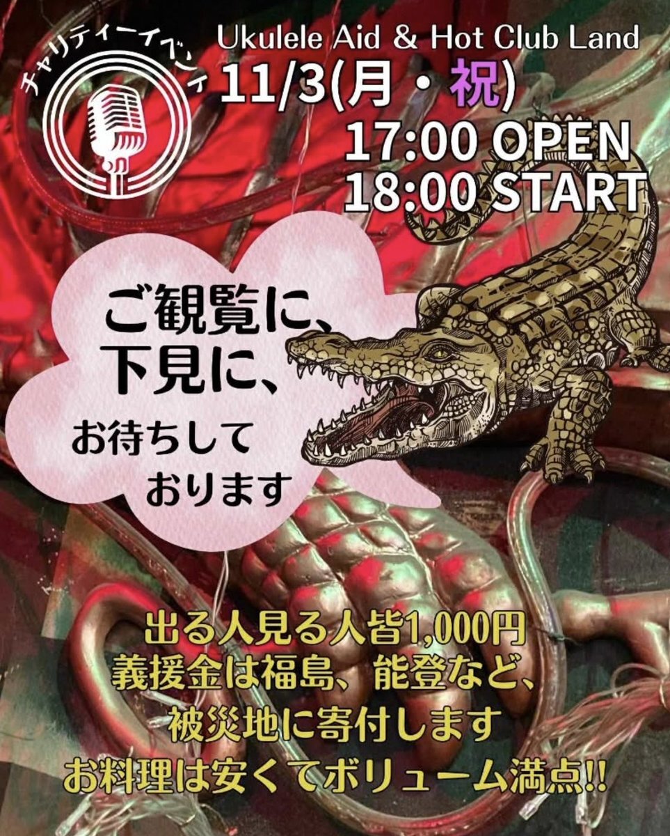 11/3(㊗️)17:00-Open!!18:00-Start⭐️ @原宿クロコダイル 『Hot Club Land & Ukulele Aid』 被災地支援チャリティーイベント に出演します。 入場¥1000-(半分は被災地への寄付になります) 💎出演順は当日決まります。 終演 21:00-すぎ予定 お越し頂けたら嬉しいです🥰 #LIVE #クロコダイル #原宿 pic.x.com/9Mm179Xc3p