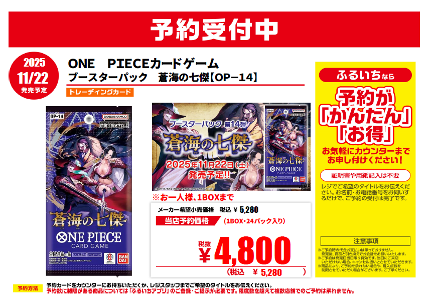 🩵予約再開 11/22(土)発売 #ONEPIECE カードゲーム ブースターパック 『#蒼海の七傑』 “王下七武海”堂々参戦‼️ 王下七武海リーダーカードが7種類収録✨そして人気のキャラクターたちが多数登場❣️ アプリ会員様限定‼️お一人様1BOXまで✨ #ハンコック #クロコダイル #ミホーク pic.x.com/k2tsHSiLJN x.com/ONEPIECE_tcg/s…