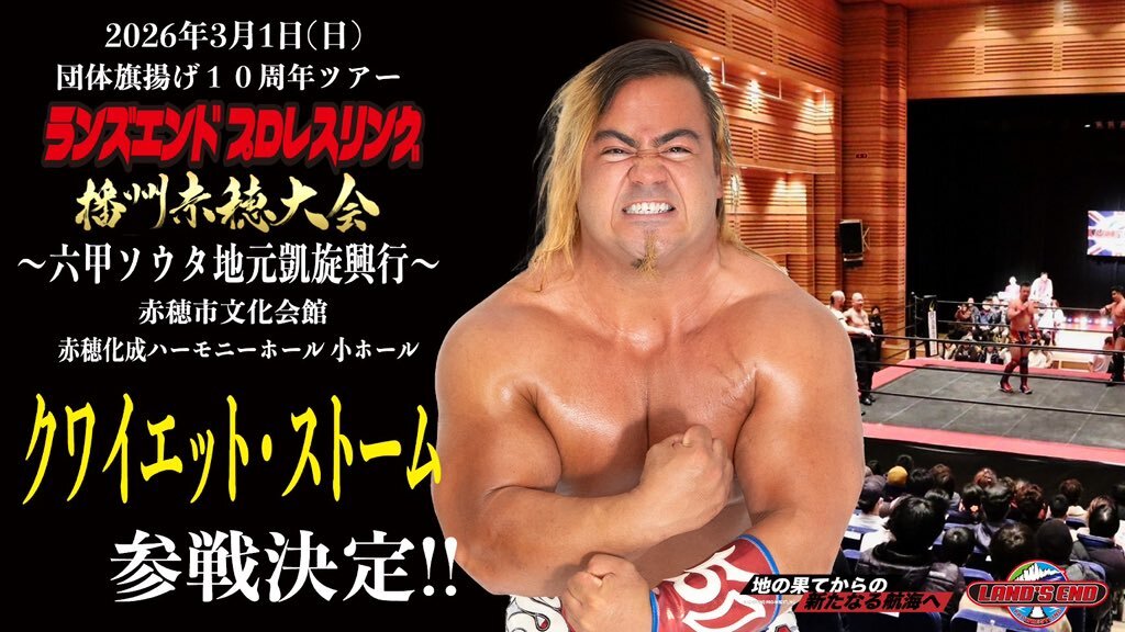 2026.3.1 ランズエンド旗揚げ10周年記念 & 六甲ソウタ地元凱旋 ランズエンド播州赤穂大会 クワイエット・ストーム選手 参戦決定❗️ #クワイエットストーム #ランズエンド #播州赤穂 pic.x.com/2n06RCThGX