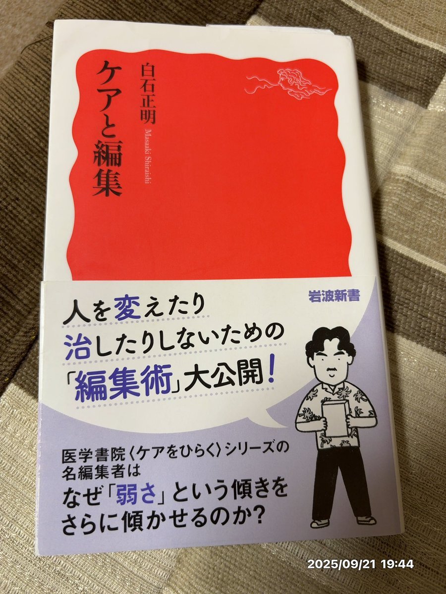 岩波新書 ケアと編集、読みました。 人を変えたり治したりしないための編集術大公開! ひとはとっても豊かな生き物なんだろうなあと思いました。 当たり前と思っていることが、果たしてほんとなのかと考えるきっかけになるかな。 #ケアと編集 pic.x.com/nJAklYM8lM