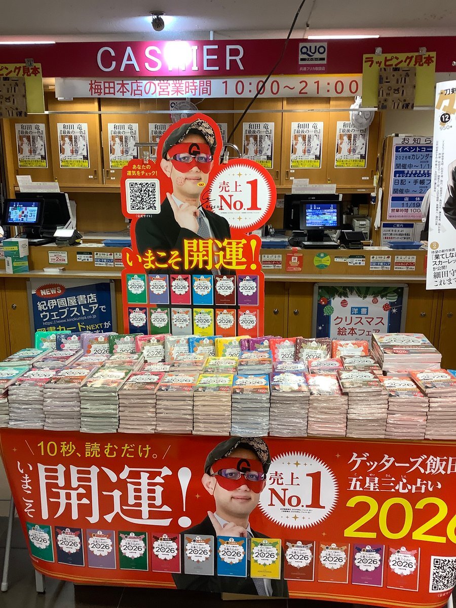 紀伊國屋書店梅田本店にてゲッターズ飯田さんにサイン本をたくさん書いていただきました❗ お近くの方はぜひサイン本ゲットしに来てください❗ #ゲッターズ飯田の五星三心占い2026 #ゲッターズ飯田 #サイン本 pic.x.com/hf8HAiAI1B