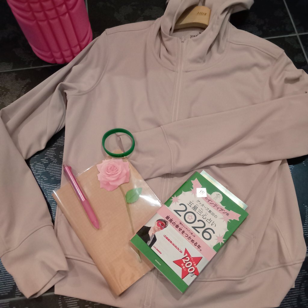派手ピンク色のフォームローラーで身体を解せし、さくら🌸ピンク色のウエアに緑のバングル。 手帳にピンクの薔薇🌹のカードとステッカーを入れてピンクのペンを添えて2026年に備えます。 緑アイテム増やさねば✨️ #ゲッターズ飯田の五星三心占い2026 #ラッキーカラー pic.x.com/9gEqeGOhOv