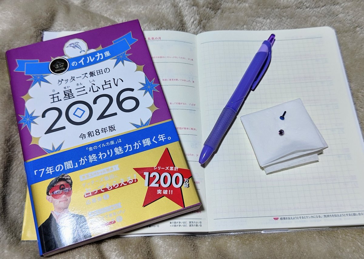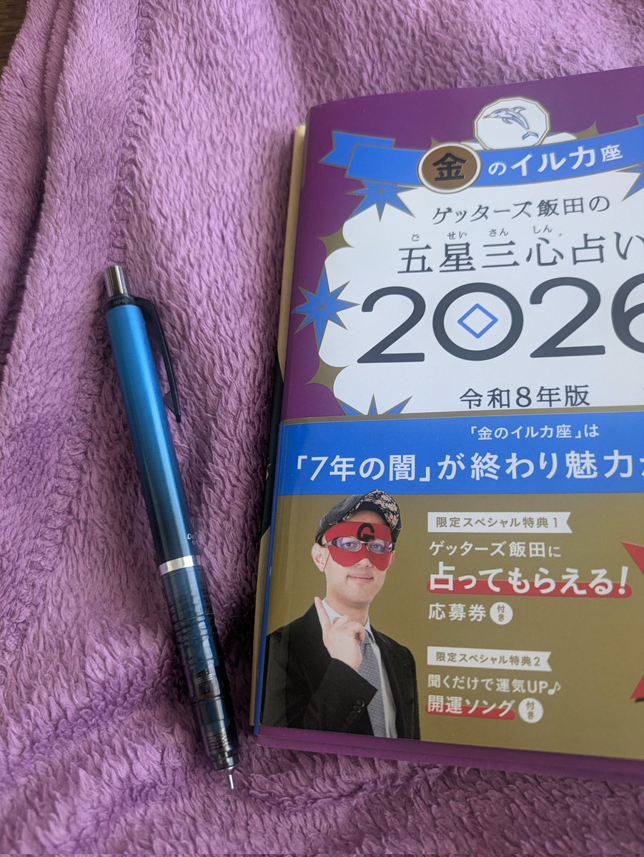 #ゲッターズ飯田の五星三心占い2026 #ラッキーカラー は、パープルと、ブルー. 毛布とペン📸。 毎日、本に目を通すのが理想だけれど、毎日が難しい時は、 月始めや、悩んだ時に開いて読んでます pic.x.com/geAwbhBvFB