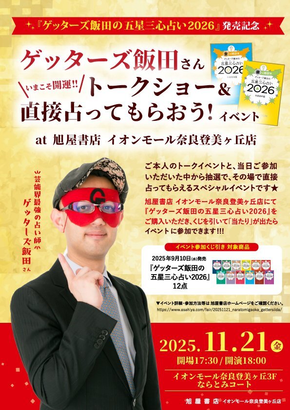ゲッターズ飯田の五星三心占い2026発売記念 いまこそ開運‼「ゲッターズ飯田さんトークショー&直接占ってもらおう」イベント at 旭屋書店イオンモール奈良登美ヶ丘店 開催決定いたしました!! 詳細は旭屋書店HPをご確認くださいませ。