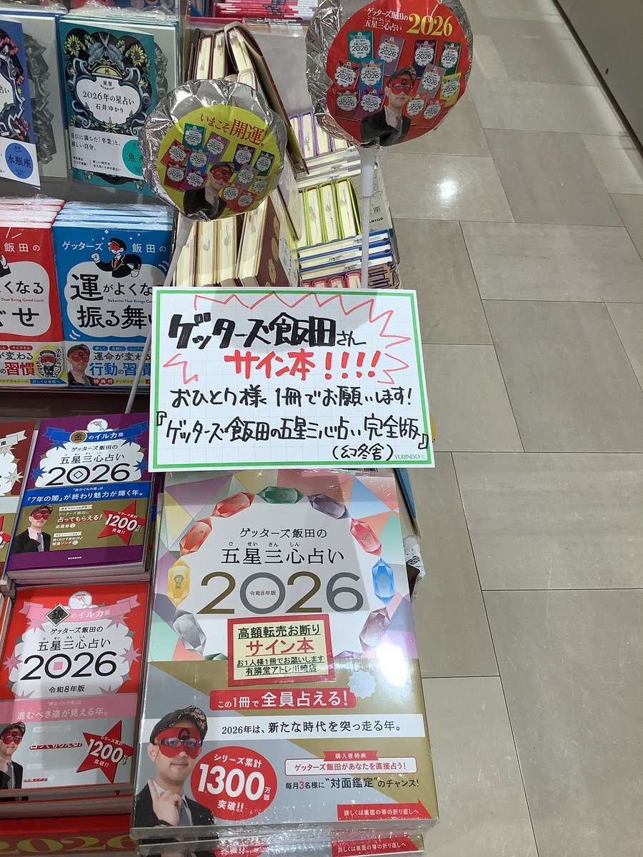 【実用】 昨日 #ゲッターズ飯田 さんのイベントが大盛況のうちに終了しました🥳ご参加の皆さま、ゲッターズさん、ありがとうございました! 『#ゲッターズ飯田の五星三心占い2026』他サイン本を作って頂きました😍 1人各種1冊📖 店頭販売のみ(取り置き・配送不可) 貴重な機会をお見逃しなく🏃🏃‍♂️🏃‍♀️💨 pic.x.com/saBgofSHbo