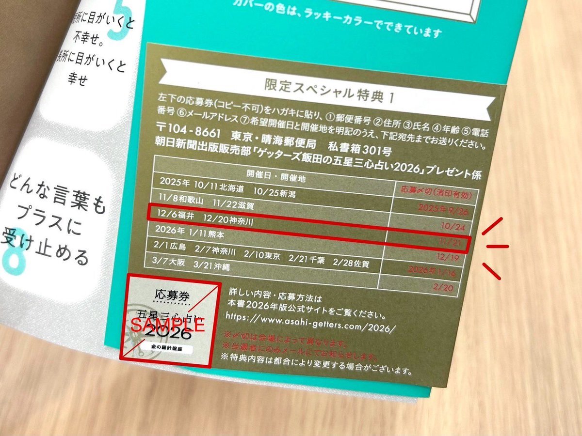 ⚠️11/21応募〆切⚠️ #ゲッターズ飯田 さんに占ってもらえるかも!? 帯には抽選で《対面鑑定権》& 《トークライブ》 が 当たる応募券が付いています✨ 福井、神奈川会場は 【11/21〆切(消印有効)】! ご応募お待ちしております〜📮 #ゲッターズ飯田の五星三心占い2026 #占い pic.x.com/SWvl01EUC5