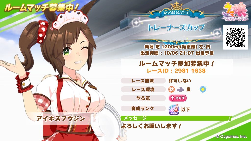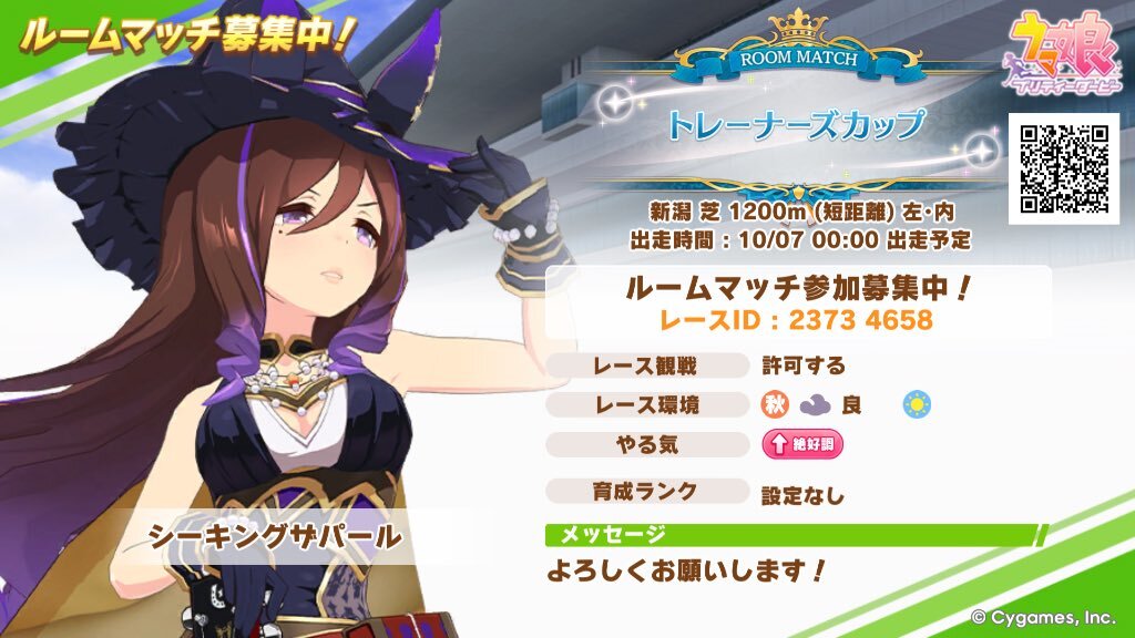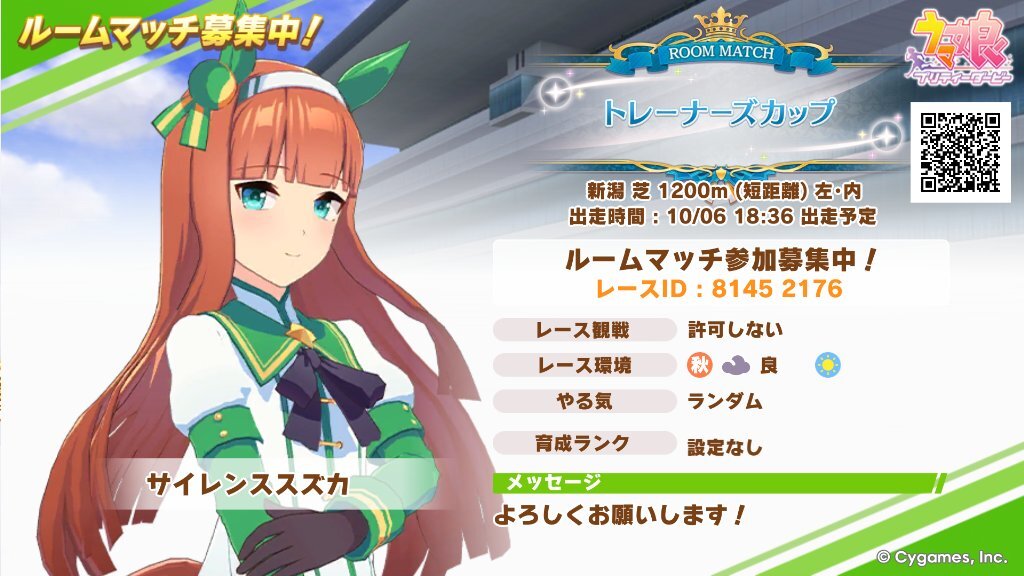 「ウマ娘 プリティーダービー」 レースID [81452176] でルームマッチを開催するよ。一緒にレースを楽しもう api-umamusume.cygames.jp/umamusume/cont… #ウマ娘 #ゲームウマ娘 #ルームマッチ開催中 pic.x.com/5cKaicvhG4
