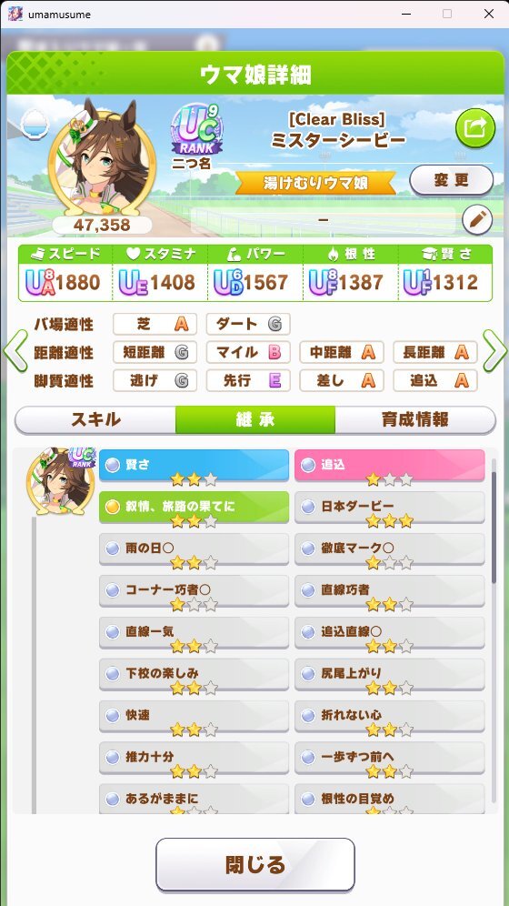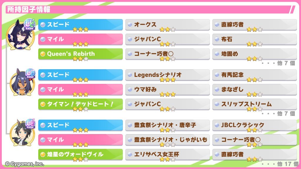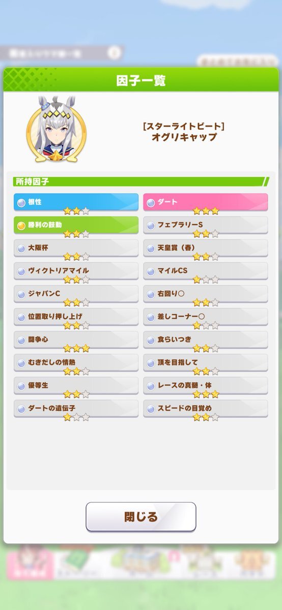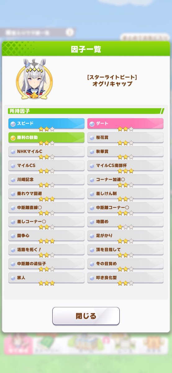 因子周回鍛錬【3日目】 昨日のデジタルで次の段階に… まだ最終段階では無いですが、中距離親作成用になるオグリ。 デジタルの【逃げためらい】や【真髄体】は継げなかったゲド…【中距離直線&コーナー】と【光明】が星3でついた‼️ ウトウト寝たのでこの育成のみ😅💦 #ウマ娘 #ゲームウマ娘 x.com/kingmanbo907rs…