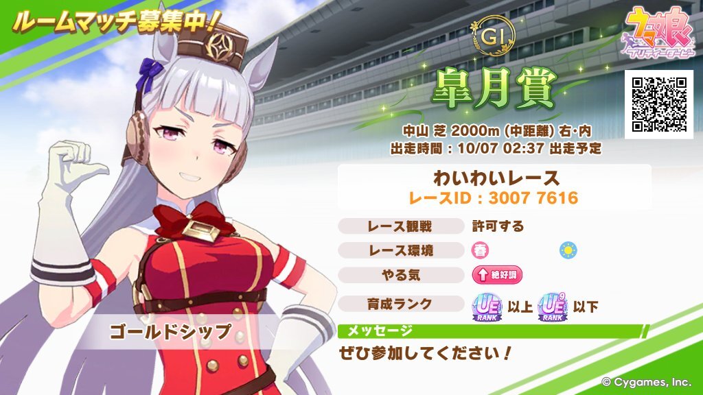 「ウマ娘 プリティーダービー」 レースID [30077616] でルームマッチを開催するよ。一緒にレースを楽しもう api-umamusume.cygames.jp/umamusume/cont… #ウマ娘 #ゲームウマ娘 #ルームマッチ開催中 pic.x.com/DJCeEI1C8g