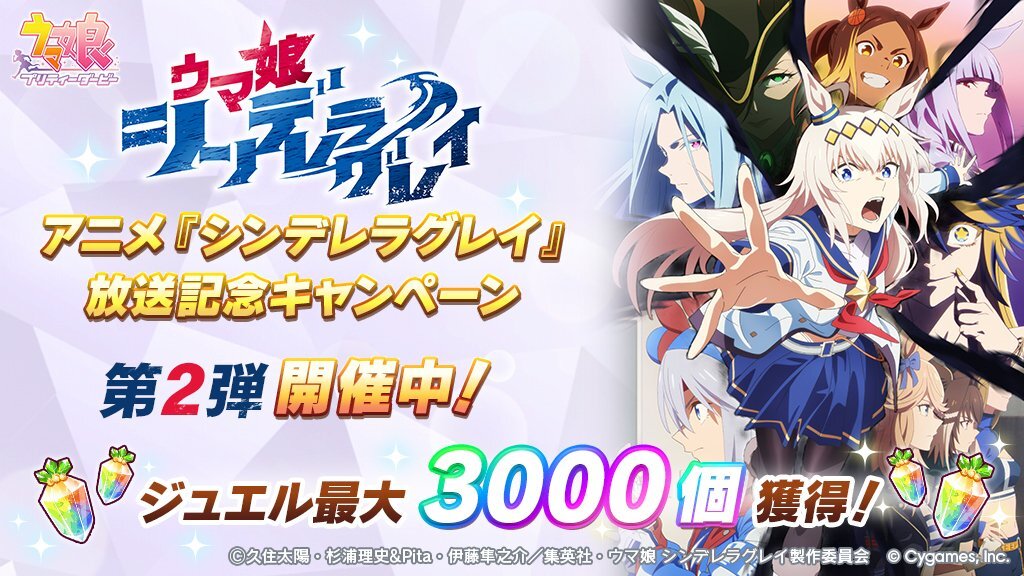 【アニメ放送記念キャンペーン開催!】 アニメ『ウマ娘 シンデレラグレイ』の放送を記念して、「アニメ『シンデレラグレイ』放送記念キャンペーン第2弾」を開催! ジュエル最大3000個獲得できるログインボーナスなど実施中! umamusume.jp/news/detail?id… #ウマ娘 #ゲームウマ娘 #アニメウマ娘 #ウマ娘 pic.x.com/FdEwvyuzNL