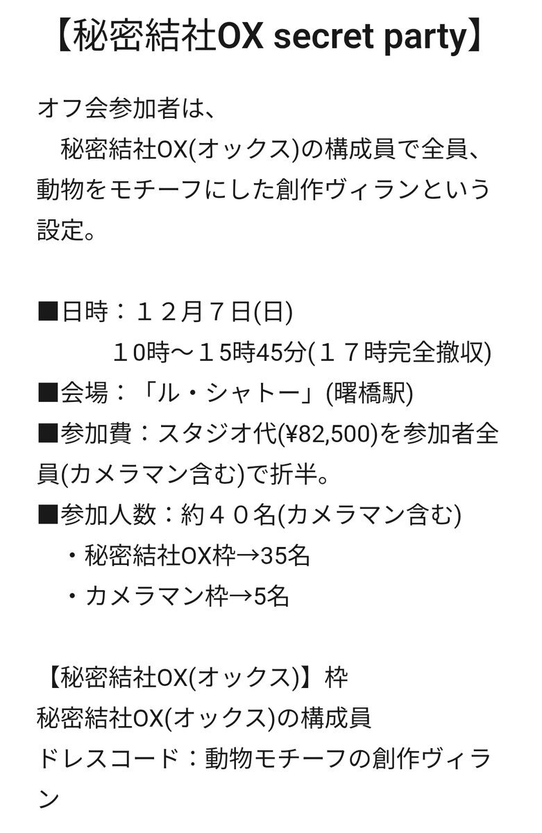 【 お知らせ 】 ◤◢◤ ̄ ̄ ̄ 【 秘密結社OX(オックス) 】 -secret party - ___◢◤◢ 【秘密結社OX(オックス)】メンバーだけの”秘密の宴“ 一 開 宴 一 #秘密結社OX #コスプレイヤーさんと繋がりたい