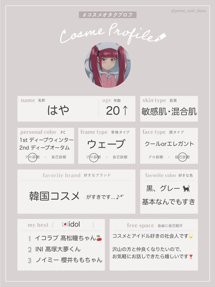 テンプレお借りしました! スキンケア、メイクアイテムは季節や気分でコロコロ変わります。 ぜひ仲良くしてください🙇♀️ #コスメ垢さんと繋がりたい #美容垢さんと繋がりたい #コスメオタクプロフ pic.x.com/n3lh2FMx3W