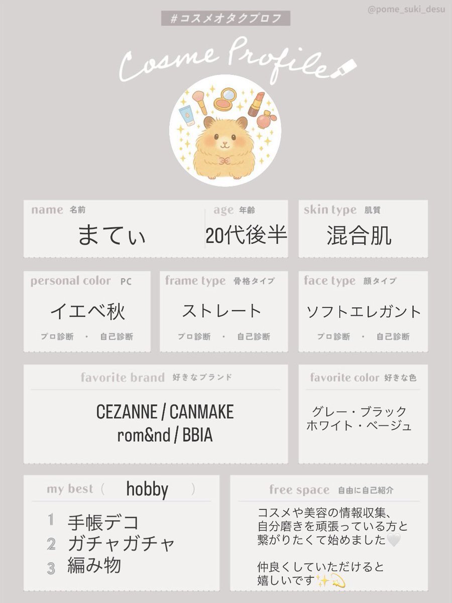 テンプレお借りました💫 初めたばかりなので仲良くしてくださるとうれしいですт т 反応くださった方お迎え行きます🫶🏻🫶🏻 #コスメオタクプロフ #コスメ垢さんと繋がりたい #コスメ好きさんと繋がりたい