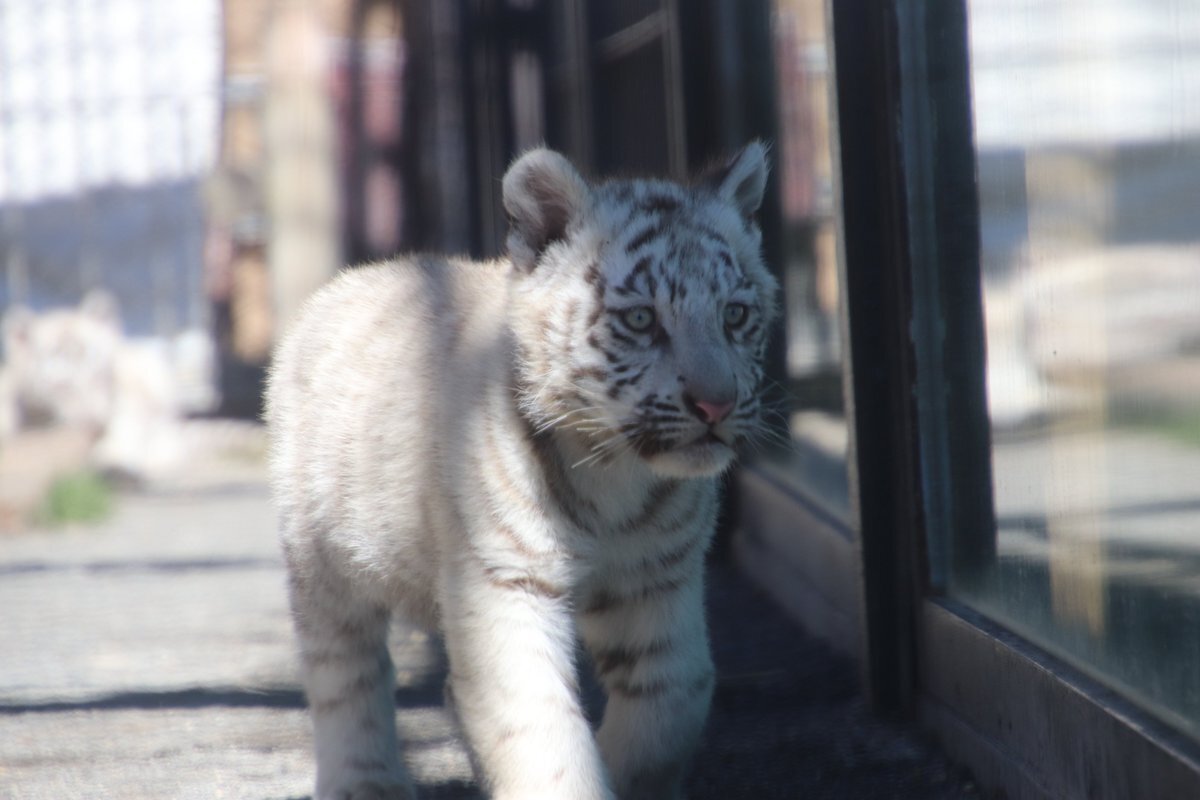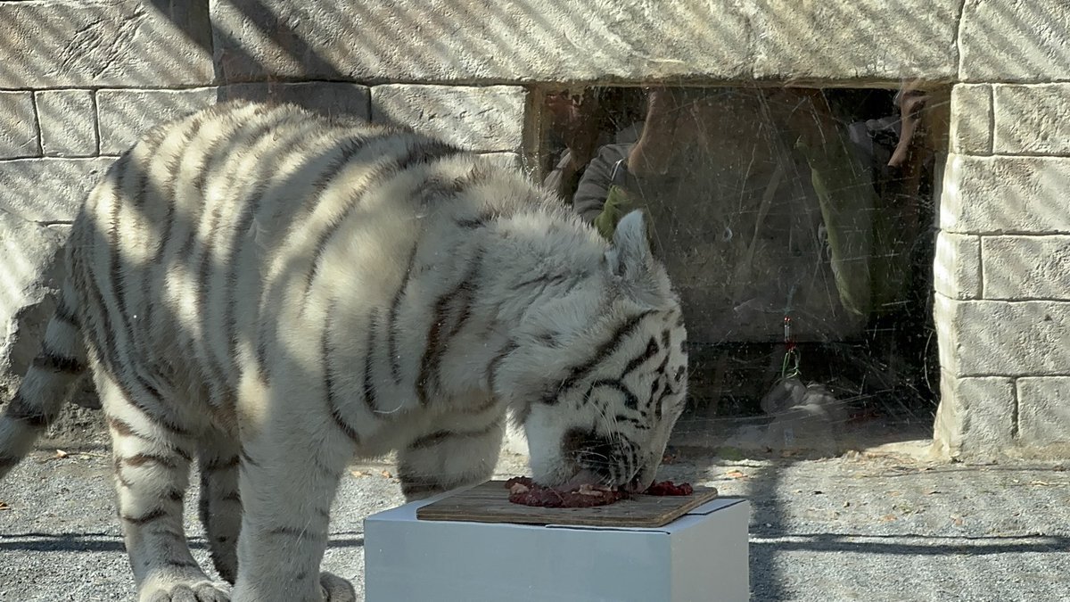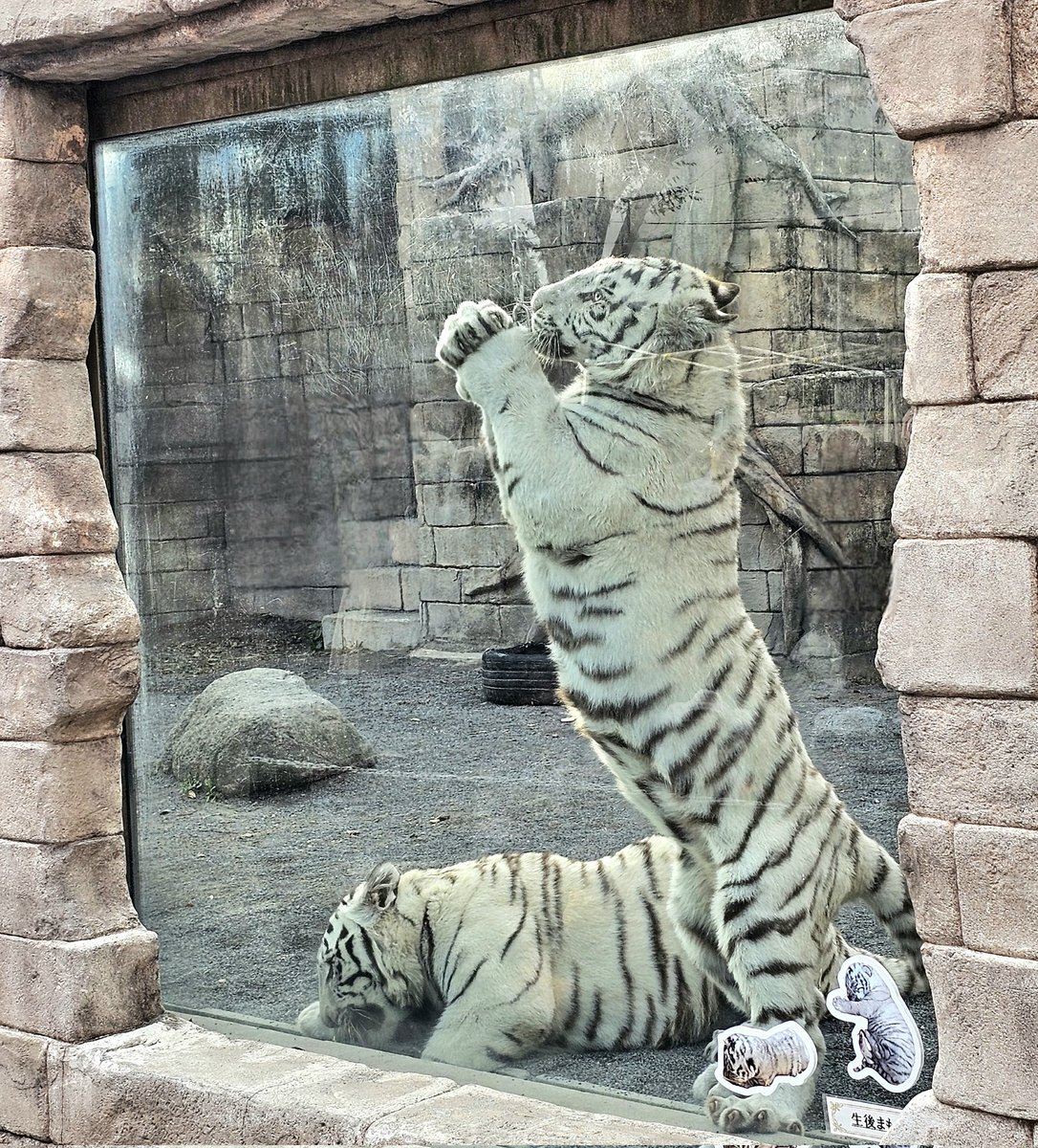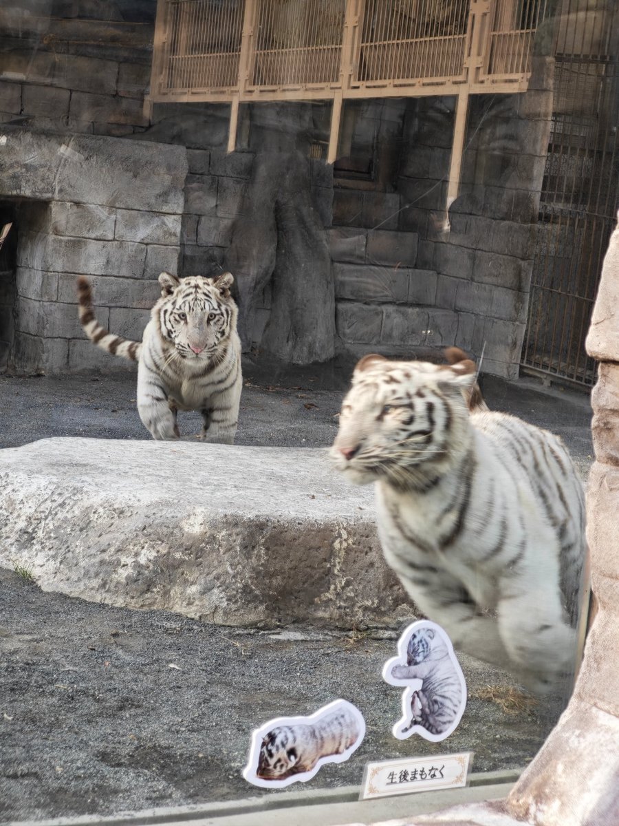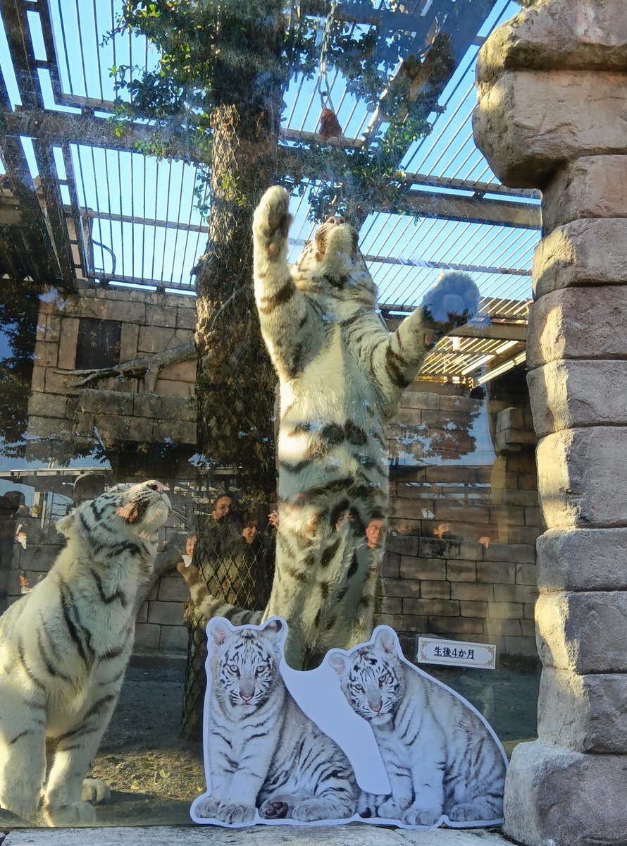 11/8東武動物公園のコタ🐯ハク 1歳🎂お誕生日おめでとうぶ㊗️の ガラス面に貼られた生後まもない写真と ホワイトタイガーガイドの🥩食べ中が 同じ姿になって、見比べると (コタ⇔ハクがたぶん違うけど) こんなにも大きくなったんだね😉 #東武動物公園🐅#コタハク #コタハクバースデーおめでとうぶ pic.x.com/QxcMqYE6CG