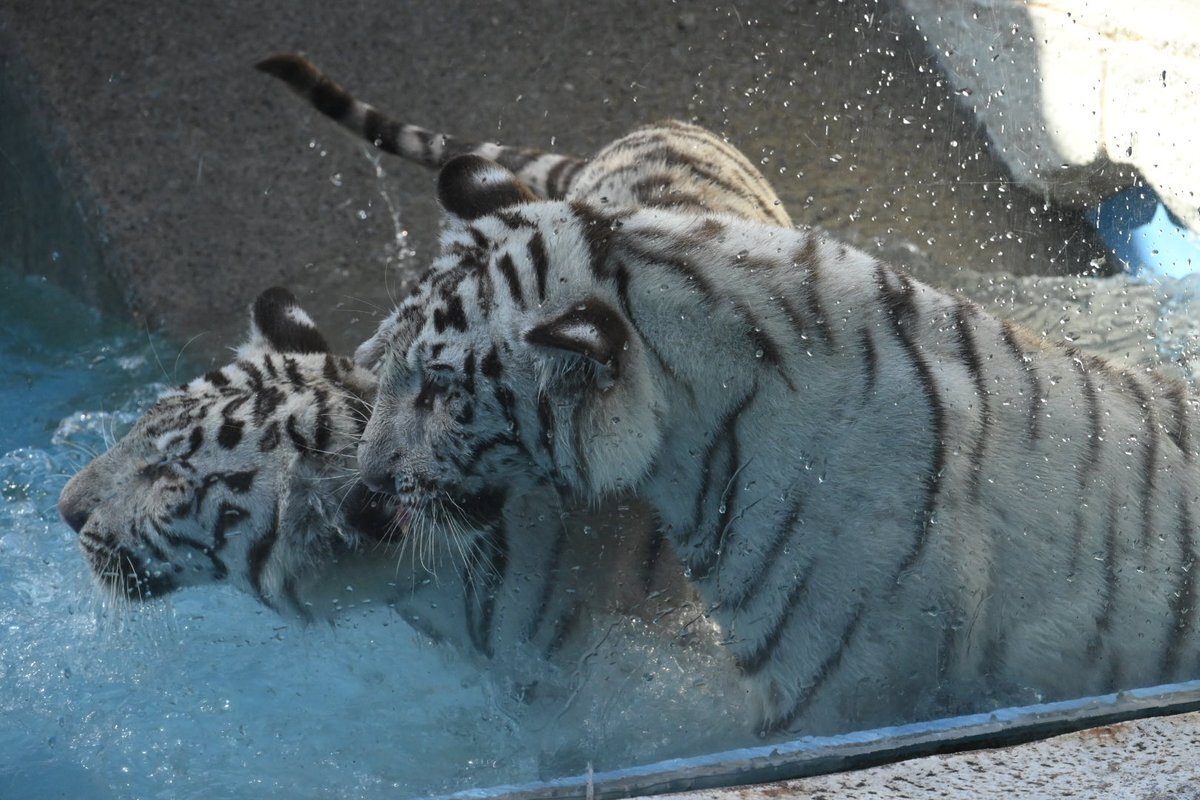 東武動物公園のホワイトタイガー コタ🐯ハク✨1歳の誕生日🎂 おめでとうぶ🎊🥩🎁 ソルティママと兄弟での水浴び💦 楽しかったね😉 #東武動物公園🐅#コタハク #コタハクバースデーおめでとうぶ #お誕生日おめでとう pic.x.com/NEI0IoO8Dl