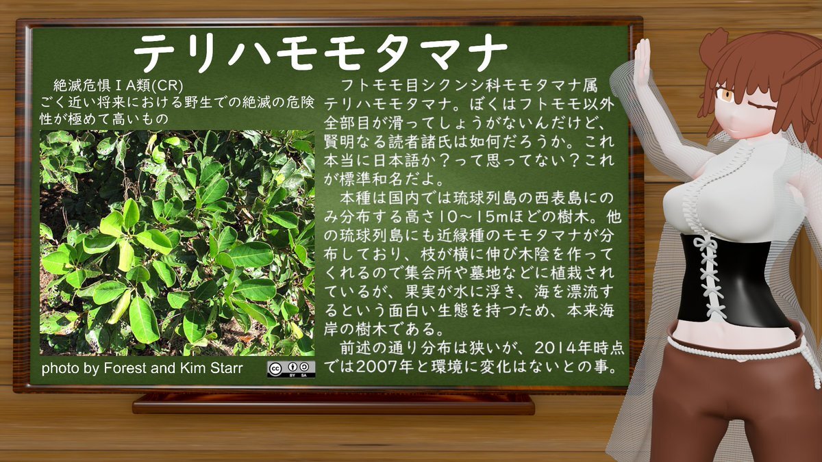 #コタンコロの絶滅危惧種を知ろう 今日の紹介は #テリハモモタマナ 実の比重が海水よりも軽く、波に流されて漂流することで分布を広げると考えられている、海岸の樹木 とはいえ本種は国内では西表島にのみ分布する種である ところでモモタマナってどういう由来の名前で……? #おはようVtuber️️ pic.x.com/Ay501coXYQ