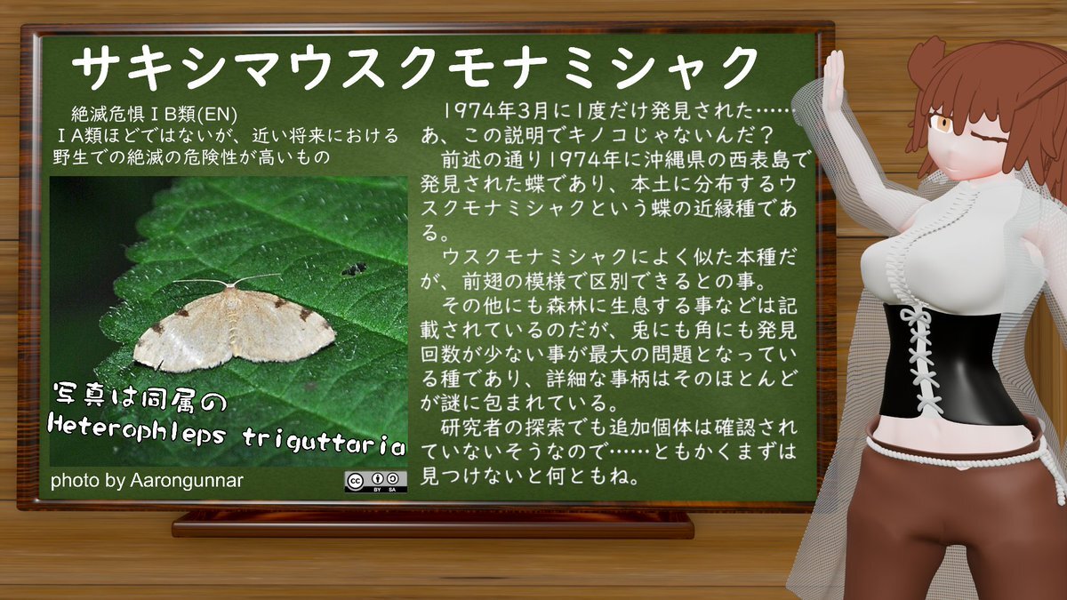#コタンコロの絶滅危惧種を知ろう 今日の紹介は #サキシマウスクモナミシャク 過去に一度だけ発見された系の絶滅危惧種 そういう生き物は大概キノコの仲間なのだが、本種は珍しく蝶々の仲間 1974年の3月に沖縄県の西表島で発見されたのが最後であり、当然研究も進んでいない #おはようVtuber️️ pic.x.com/jD7RFTTxMA