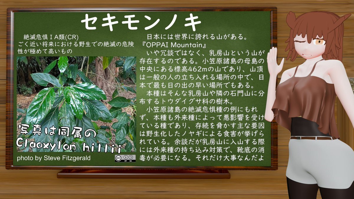 #コタンコロの絶滅危惧種を知ろう 今日の紹介は #セキモンノキ 日本には『OPPAI Mountain』が存在する。今回はそれだけでも覚えて帰って貰いたい 母島の中央にそびえる「日本で最も早い初日の出を見れる場所」であり、本種はそんな乳房山と隣の石門山に分布する樹木である #おはようVtuber️️ pic.x.com/RdDrZLF2RP