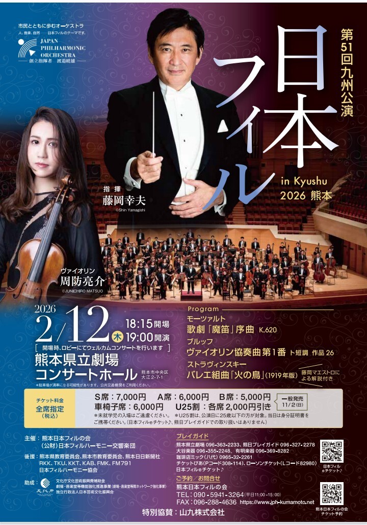 日本フィルハーモニー交響楽団🎻 第51回九州公演 熊本県立劇場 コンサートホール 2026年2月12日(木)19:00開演 ・モーツァルト:歌劇「魔笛」序曲 ・ブルッフ:バイオリン協奏曲第1番 ・ストラヴィンスキー:バレエ組曲「火の鳥」 チケット🎫 熊本日本フィルの会 090-5941-3264(平日11:00〜15:00)