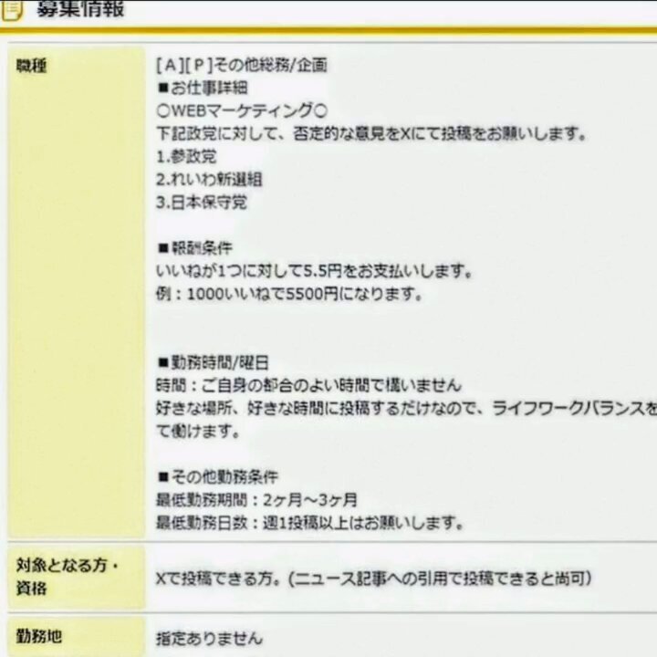 ◉手動工作員の追加募集 参政党 れいわ 保守党を、けなせば儲かる ◉なんや…これ? たぶん電通が10円で受けて 下請けに7円 新規工作員に5円(消費税0.5) ◉注文してるのは 自民? 立憲? それとも? ◉支持者に回覧 ◉工作垢を早急に徹底ブロック ※まだ安静中なんでレスしません