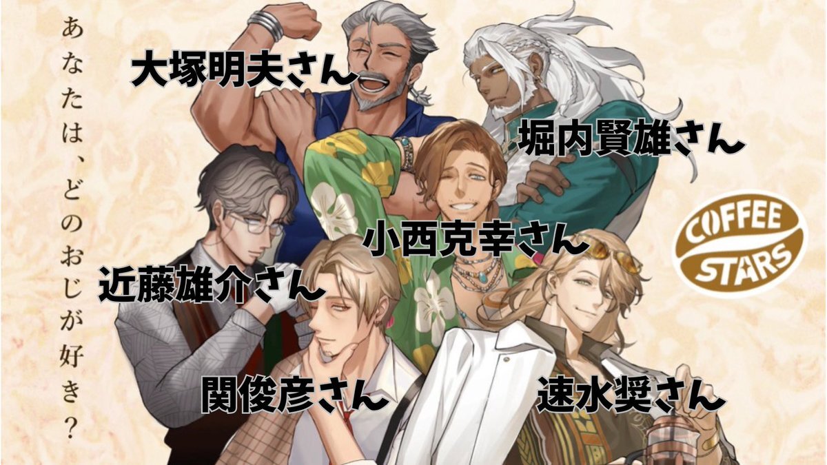 #コーヒースターズの声をお願いするなら とりあえず 黒田崇矢さん 大塚明夫さん 東地宏樹さん 諏訪部順一さん 大塚芳忠さん 速水奨さん 中尾隆聖さん 高橋英則さん この辺りをぜひぜひ…!!