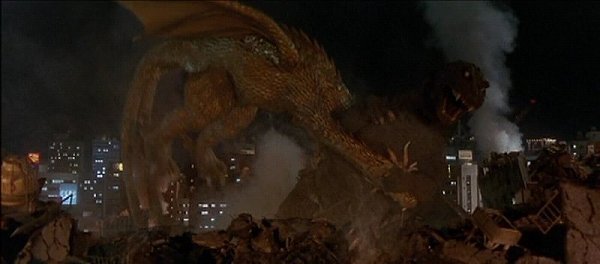 #ゴジラモスラキングギドラ大怪獣総攻撃 ギドラの肉片が降り注ぐ中、吠えるゴジラが怖い。 pic.x.com/NZUUOTWD5F