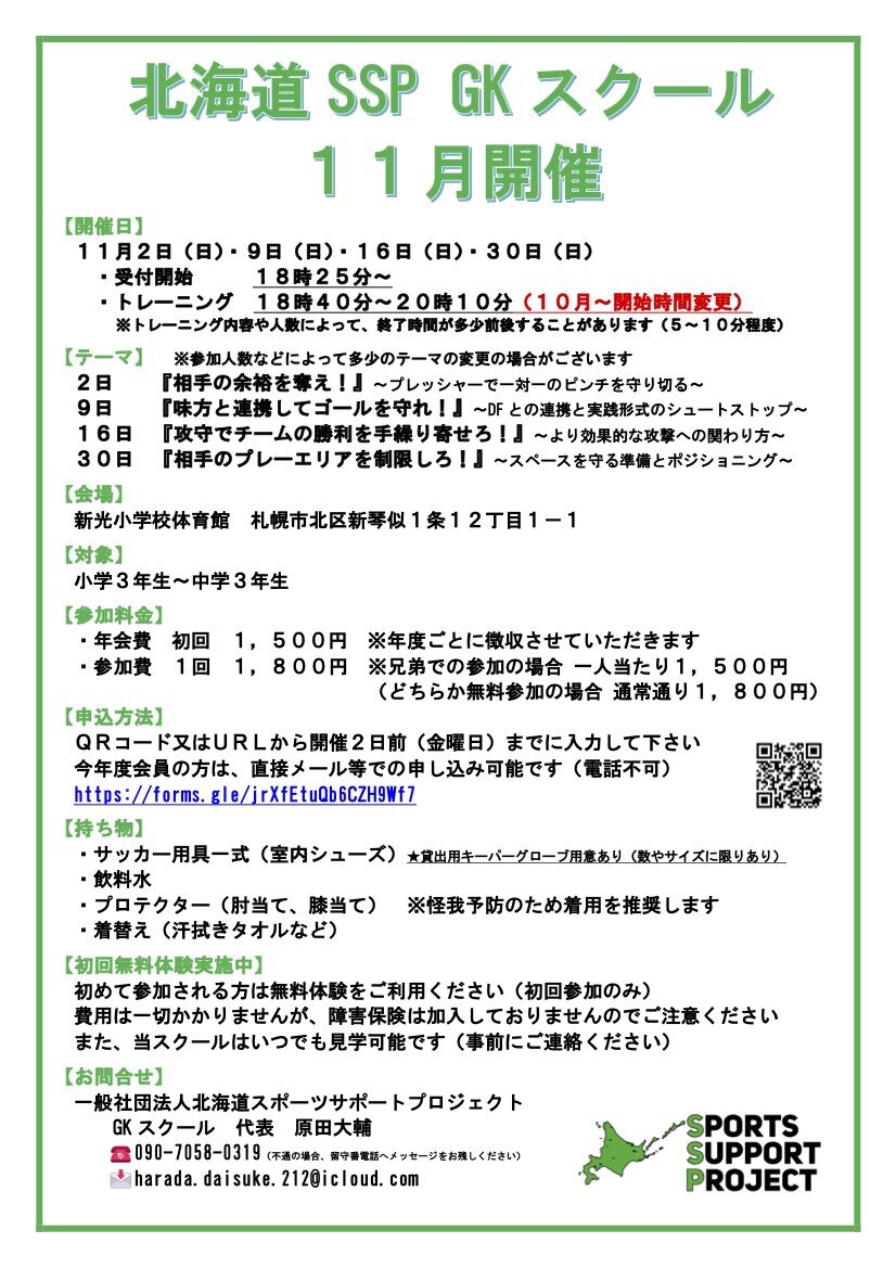 11月の #北海道SSPGKスクール 開催日 2・9・16・30日(日)18:25受付〜/新光小学校体育館🏫 毎回テーマが変わる実践トレーニング🔥 💴1回1,800円(初回年会費1,500円) 🧤初回無料体験OK! 申込はプロフィールリンクから✅ #北海道SSP #GKスクール #ゴールキーパー #札幌サッカー #北海道サッカー pic.x.com/UAfo6XbWZr