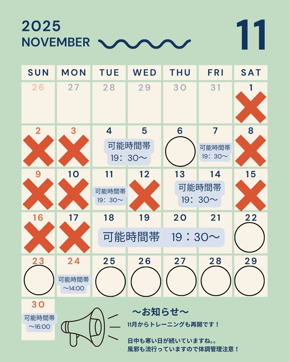 11月のプライベートトレーニング&オンライン座学日程📅 一人ひとりのためにトレーニングを準備し、成長に繋げます⚽️ 興味のある方はぜひご連絡ください📩 #プライベートトレーニング #オンライン座学 #サッカー #ゴールキーパー #GK #少年サッカー #キーパーコーチ pic.x.com/mzNlki2L6j