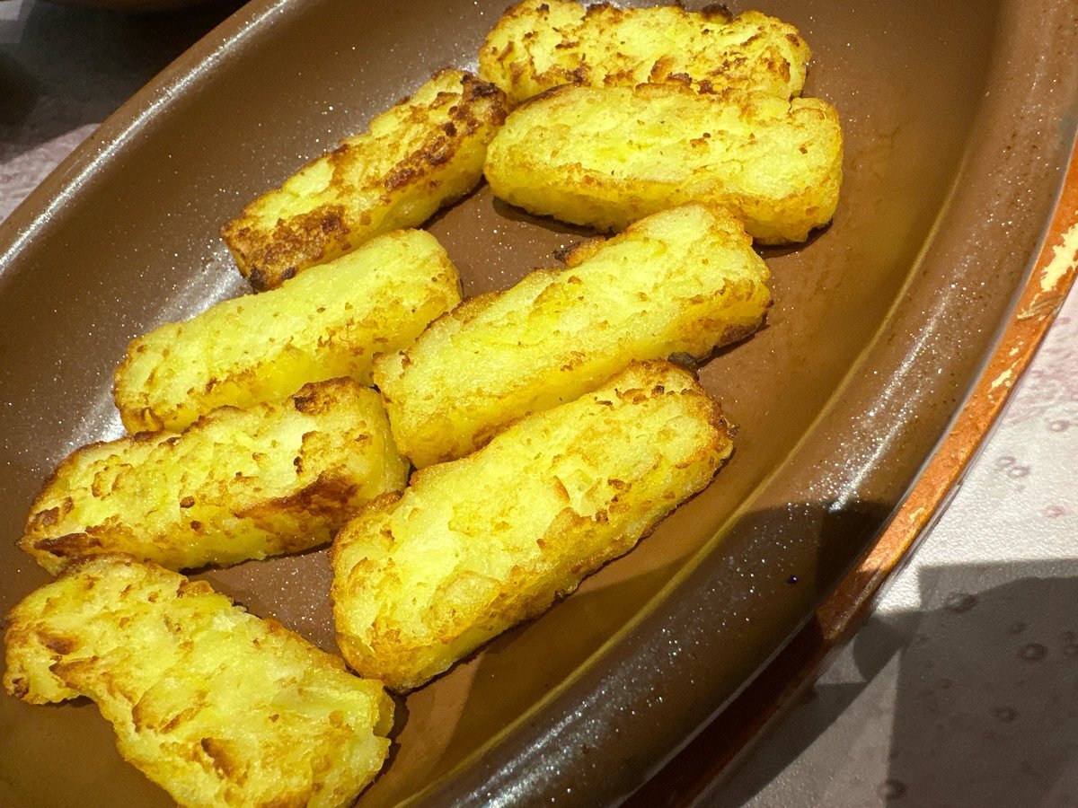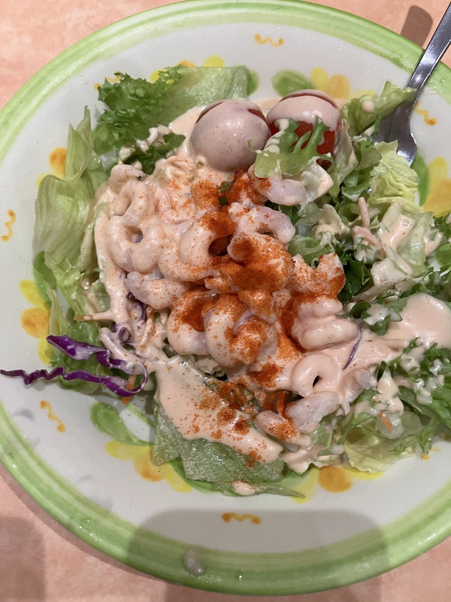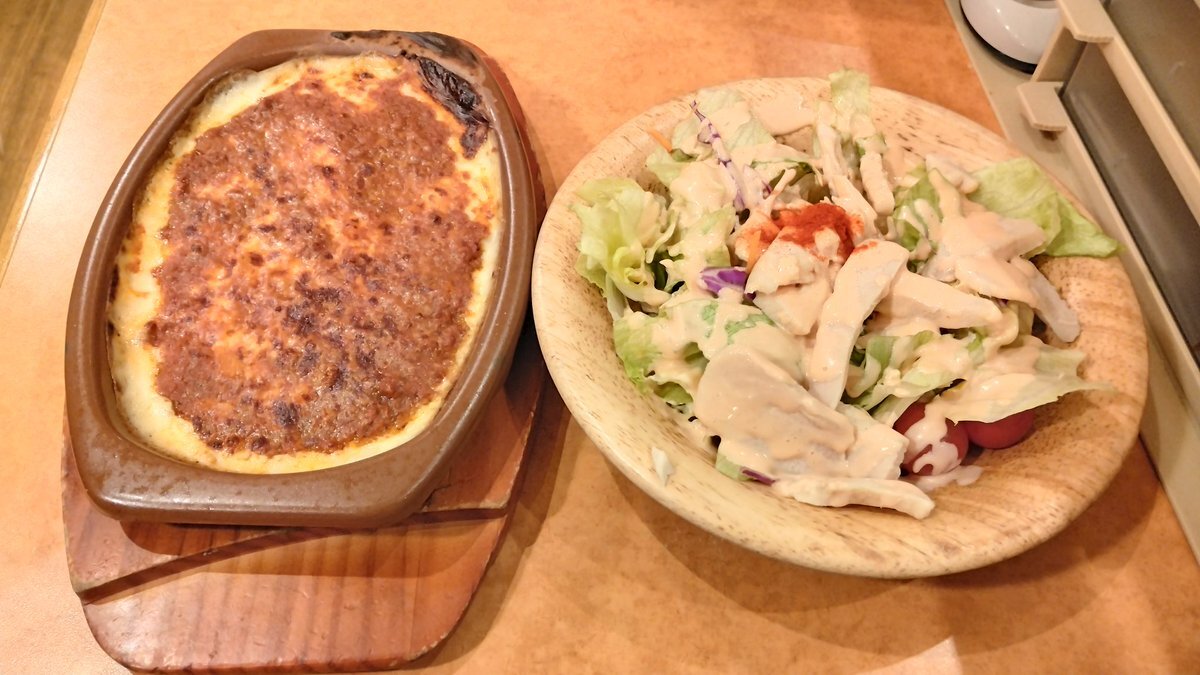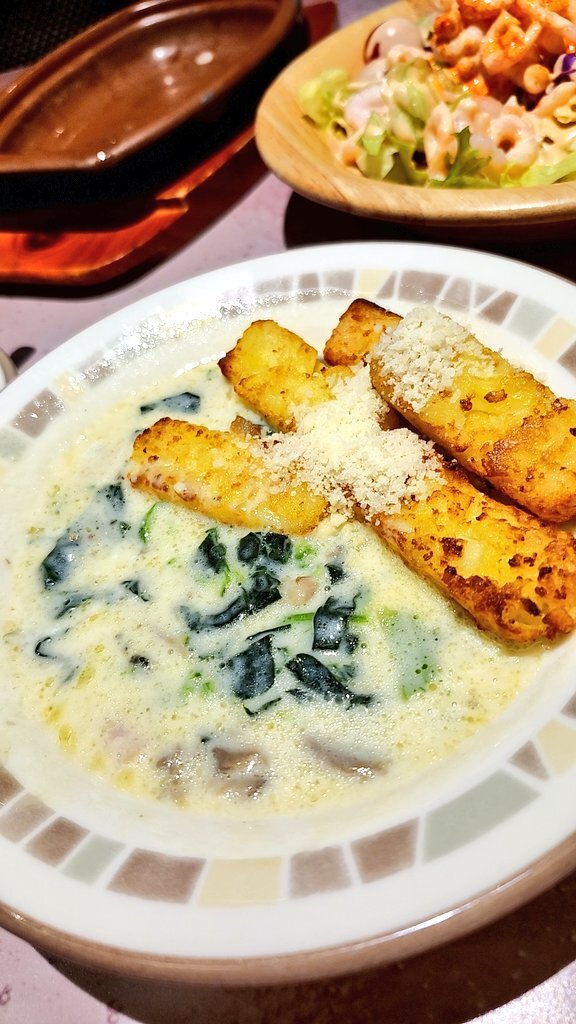 👮「すみませーん! きのことほうれん草のクリームスパゲッティを、 ソースとパスタ別々でお願いします。」 👧「かしこまりました。」 そして出来あったのがこれや。 ◆1品目 カリッとポテトときのことほうれん草と粉チーズのクリームシチュー ◆2品目 小エビのサラダパスタ #サイゼリヤ