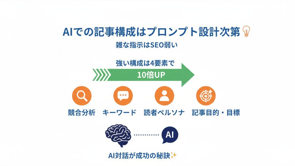 AIに丸投げしてるブログ初心者へ⚠️ プロンプト設計を知らないと損してます😅 たった4つの要素(競合分析・キーワード・ペルソナ・目的)を追加するだけでAIの構成力が10倍UP🔥 SEOに強い記事の作り方はプロフへ💡 特化ブログのコツも公開中✨ #サイト設計 #ブログ初心者 #記事構成 pic.x.com/vAzFkqR46Q