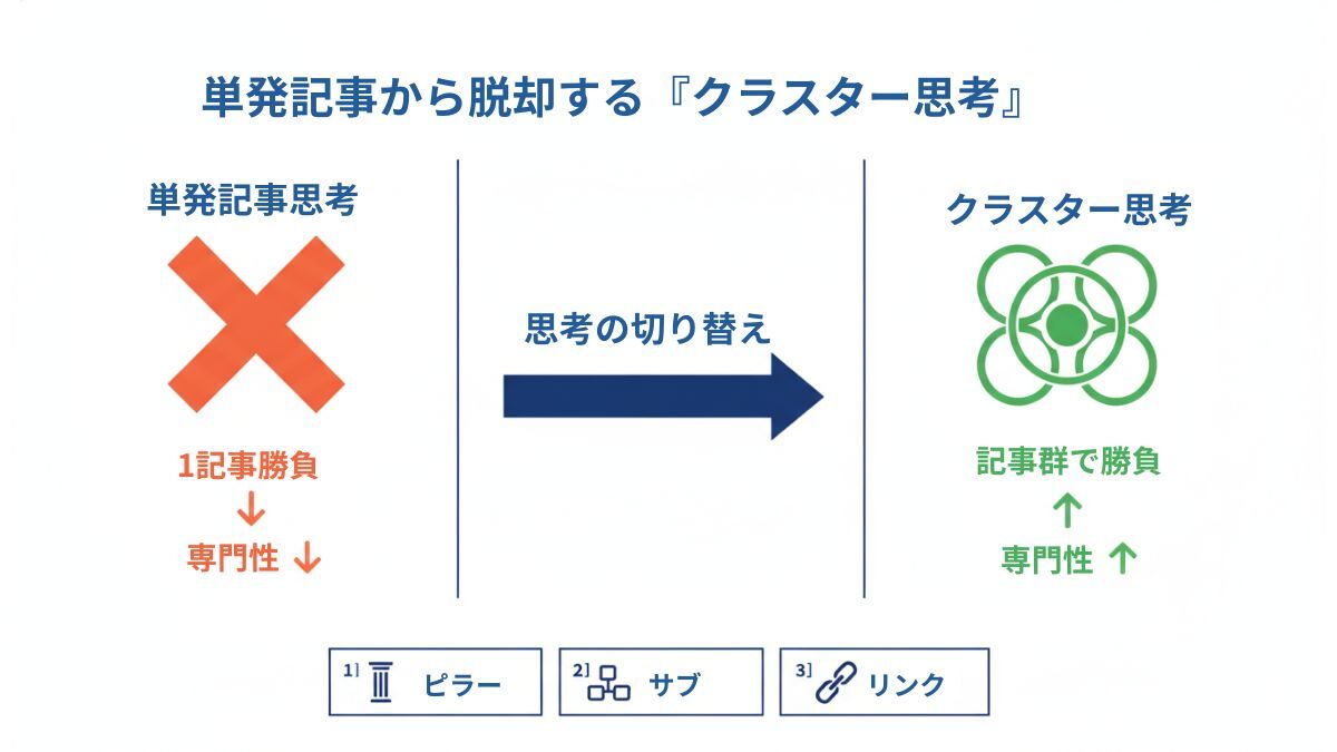 「1記事で勝負」から「記事群で勝負」への思考転換が成功の鍵🔑 単発記事は限界💦 クラスター思考で関連記事をグループ化し面で攻める⚡ この思考転換だけで結果が劇的に変わる🚀 #トピッククラスター #ブログ初心者 #サイト設計 #記事構成 pic.x.com/aWX4w9UR97