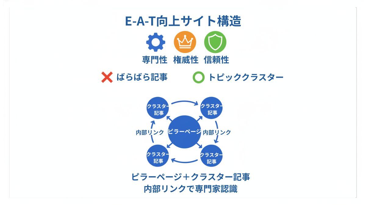 GoogleのE-A-T評価を劇的に高める方法📢 バラバラな記事ではなく、トピッククラスター構造で専門性・権威性・信頼性を証明✨ Googleに専門家として認識されよう🚀 #トピッククラスター #ブログ初心者 #サイト設計 #記事構成 pic.x.com/HAyszJ1Rje
