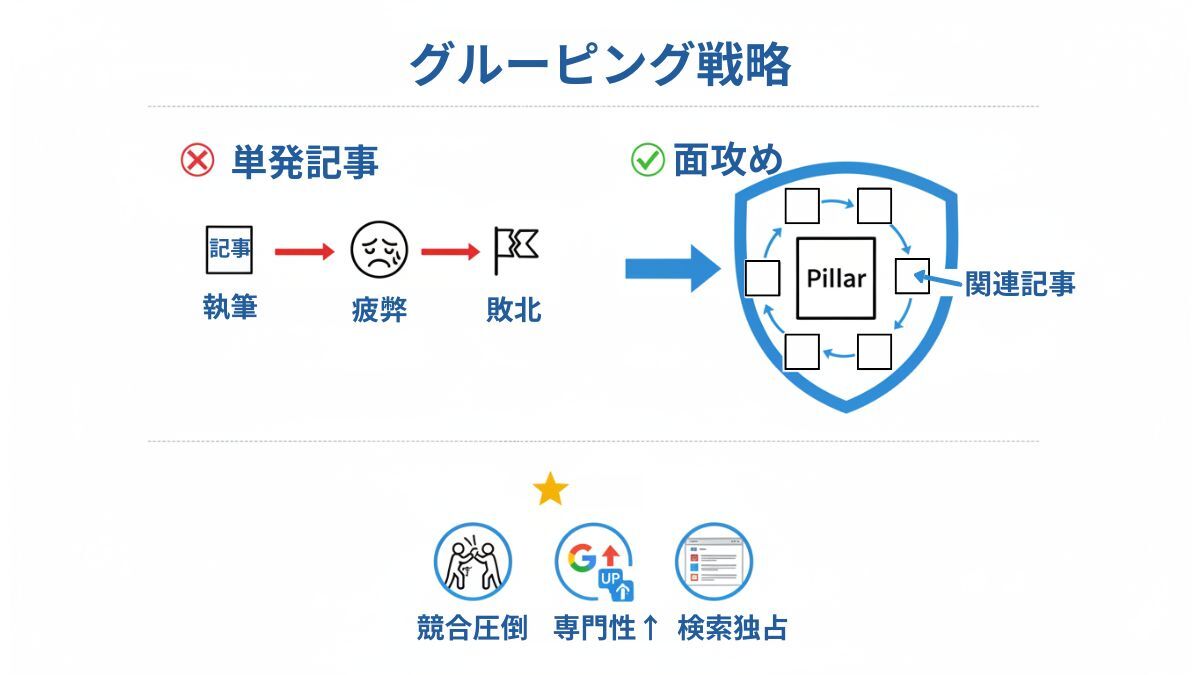 競合に勝つ秘密は記事のグルーピング戦略💡 1記事ずつ個別勝負はNG💦 関連記事をまとめて「面で攻める」トピッククラスター戦略で競合を圧倒🚀 #トピッククラスター #初心者 #サイト設計 #記事構成 pic.x.com/pmC6UxTwAg