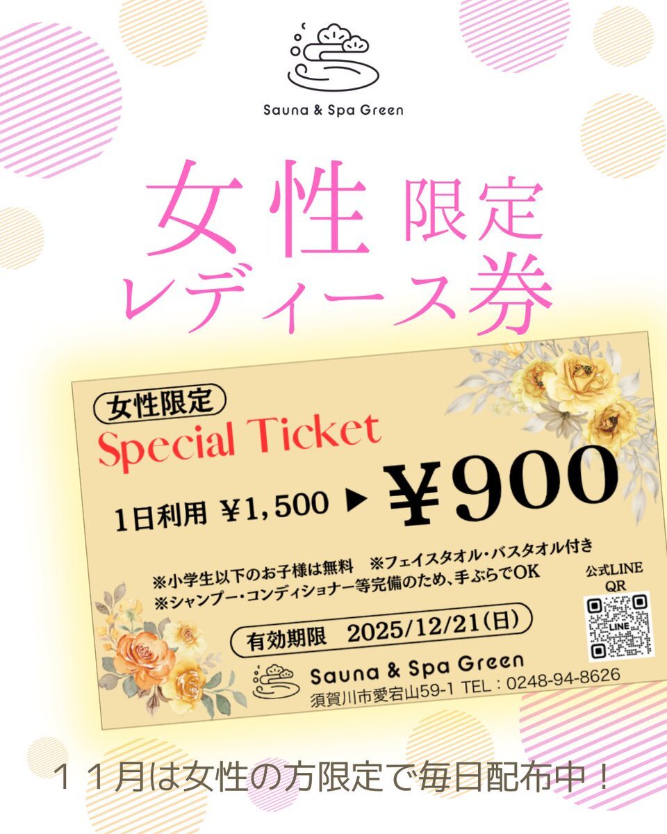 女性の方必見‼🤩 #サウナアンドスパグリーン ♨11月は毎日 女性限定 🌼レディース券🌼配布中‼ なんと‼1日利用1500円→900円になる券配布中‼ この機会に是非~‼ #須賀川市 #郡山市 pic.x.com/f1EcMUUfGD