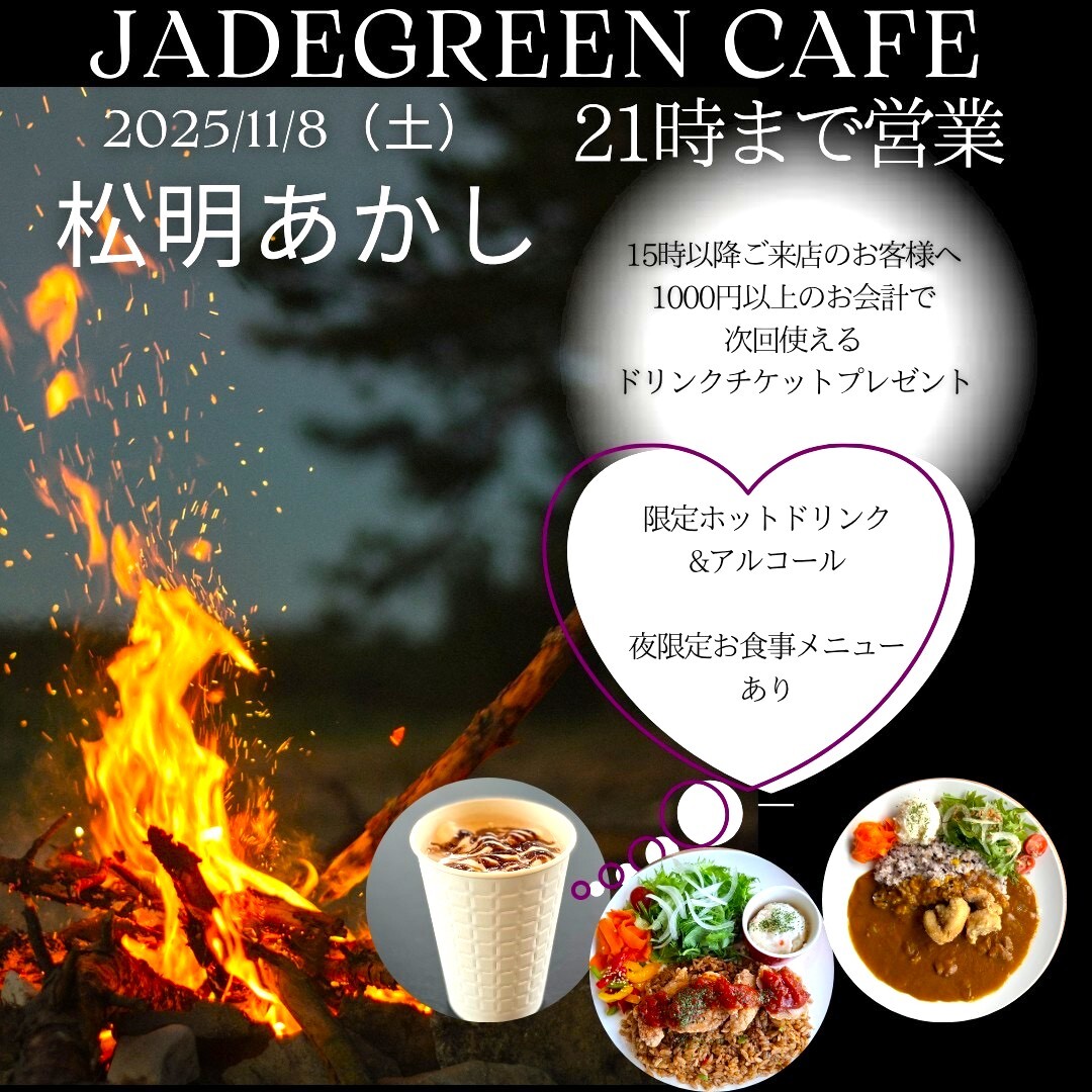本日🔥 #松明あかし🔥 #Jadegreencafe は21時まで営業‼ 1000円以上のお会計で ドリンクチケットプレゼント‼ 限定ドリンクやアルコール 限定お食事メニューもあり‼ #サウナアンドスパグリーン は22時まで営業‼ 屋外出店にて唐揚げや串こんにゃくなど販売中‼ 皆様お越しをお待ちしております😊 pic.x.com/qryPcbqo6U