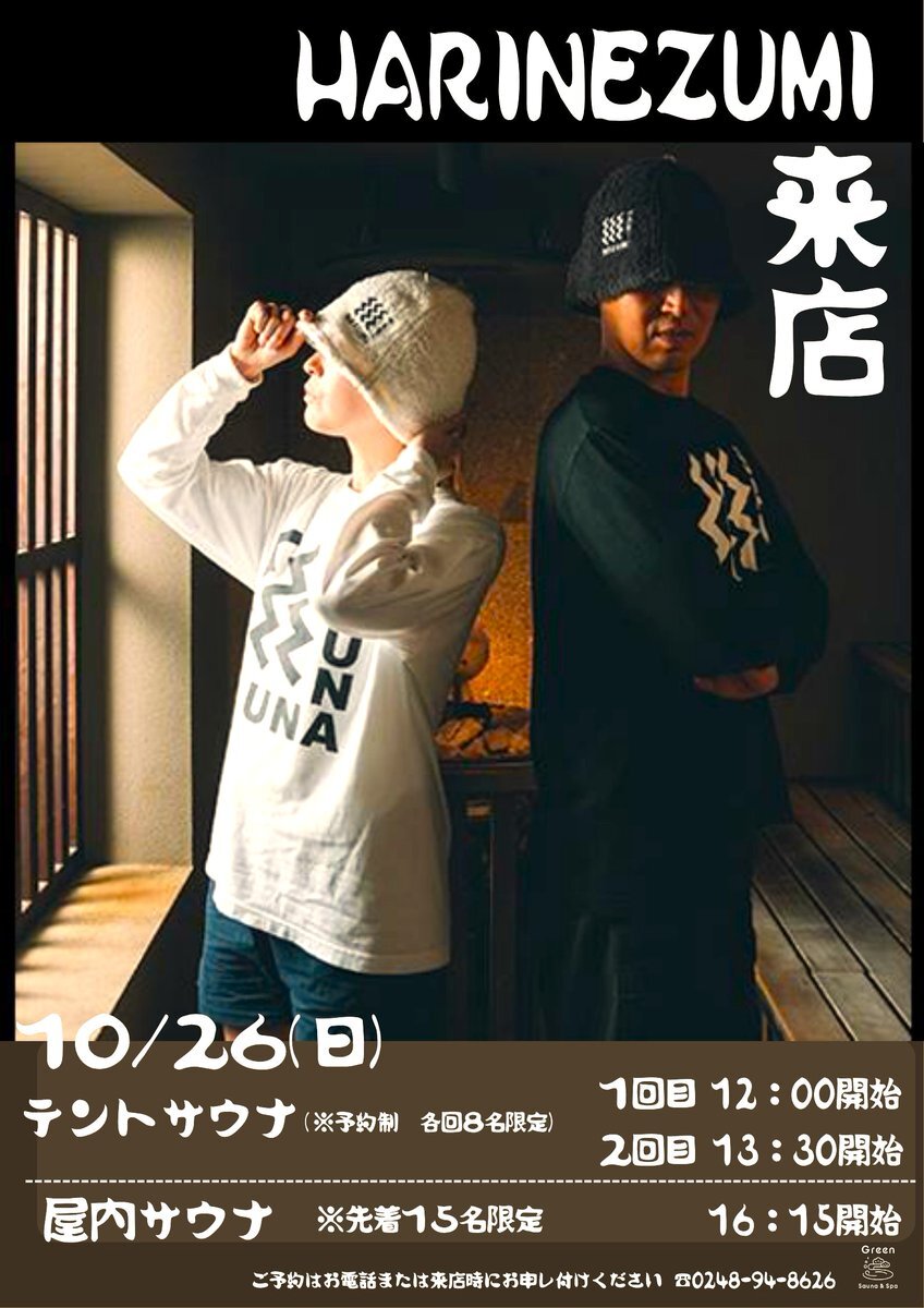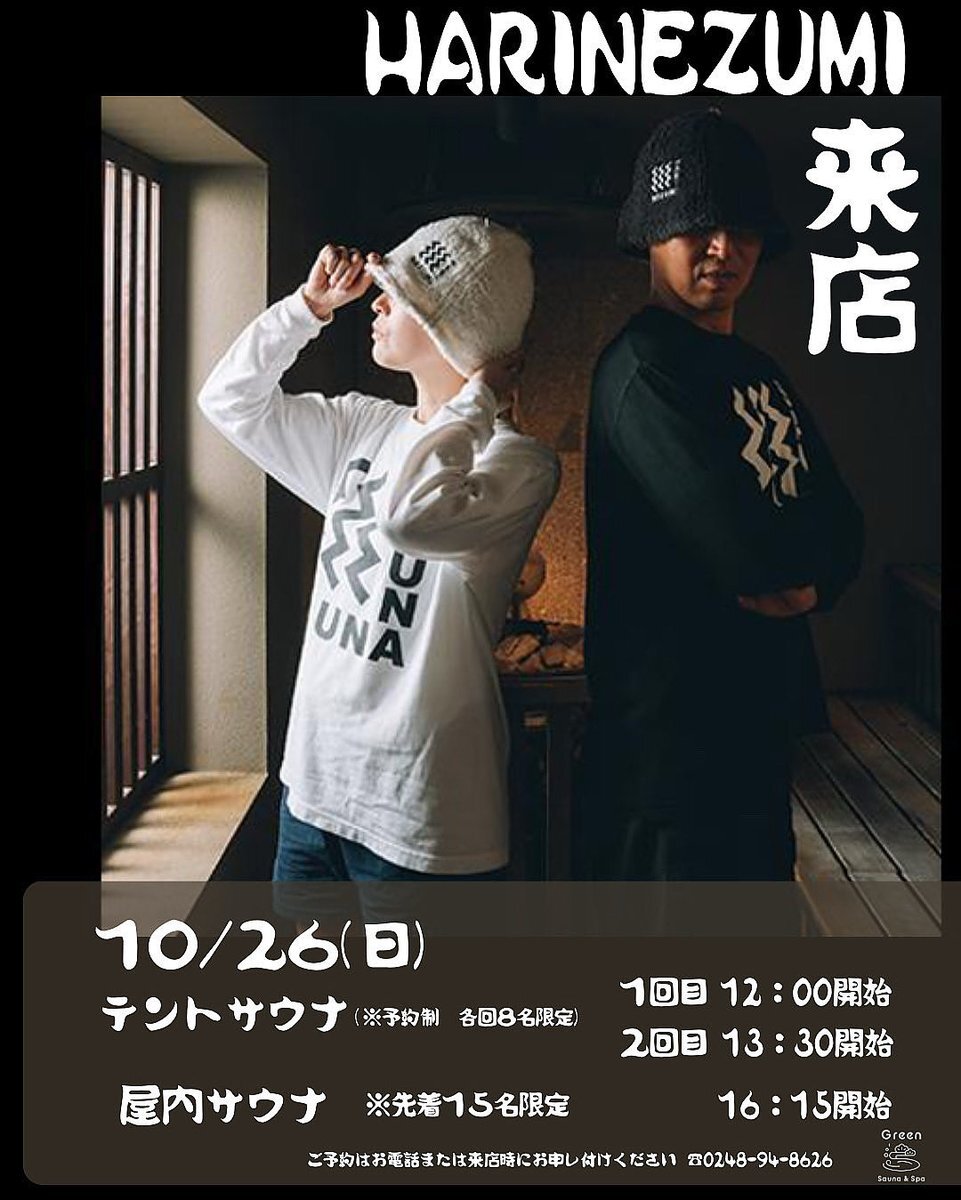 明日10/26(日) #サウナアンドスパグリーン 🦔HARINEZUMI 🦔 SZKさん&てんちよさんのイベント開催‼ @harinezumisauna 12:00/13:30は屋外テントサウナにて各回8名‼ 16:15からは男女サウナ室にて先着15名‼ #HARINEZUMI グッズも絶賛発売中‼ 楽しみすぎる~😆🔥 #サウナイキタイ #郡山 #須賀川市 pic.x.com/AiAIw3TONg
