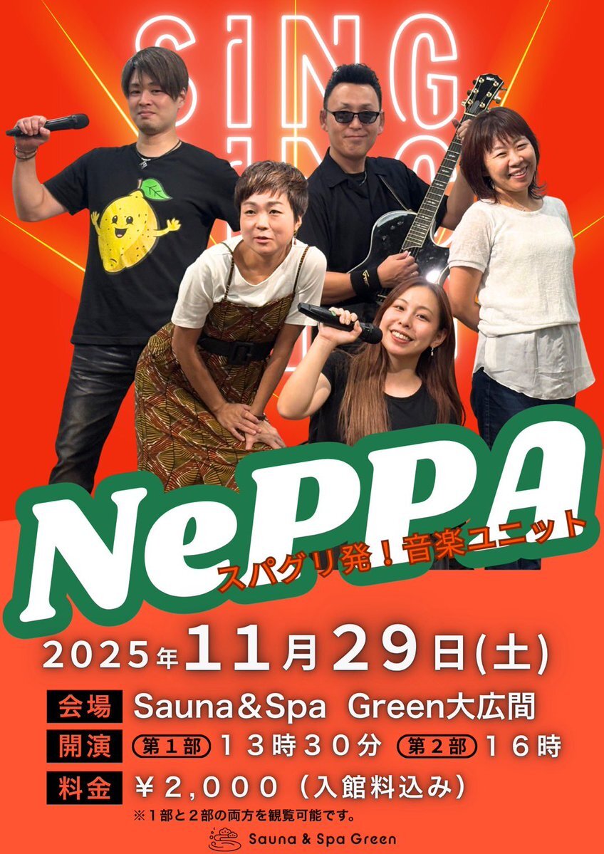#サウナアンドスパグリーン にて 11月29日(土) スパグリ音楽ユニット🎤 【NePPA】ライブ開催‼ 第一部 13:30~ 第二部 16:00~ 入館料込み2000円(一部・二部両方観覧可) 皆様のお越しをお待ちしております☺️ #須賀川市 #郡山市 pic.x.com/E4vqH1JOTg