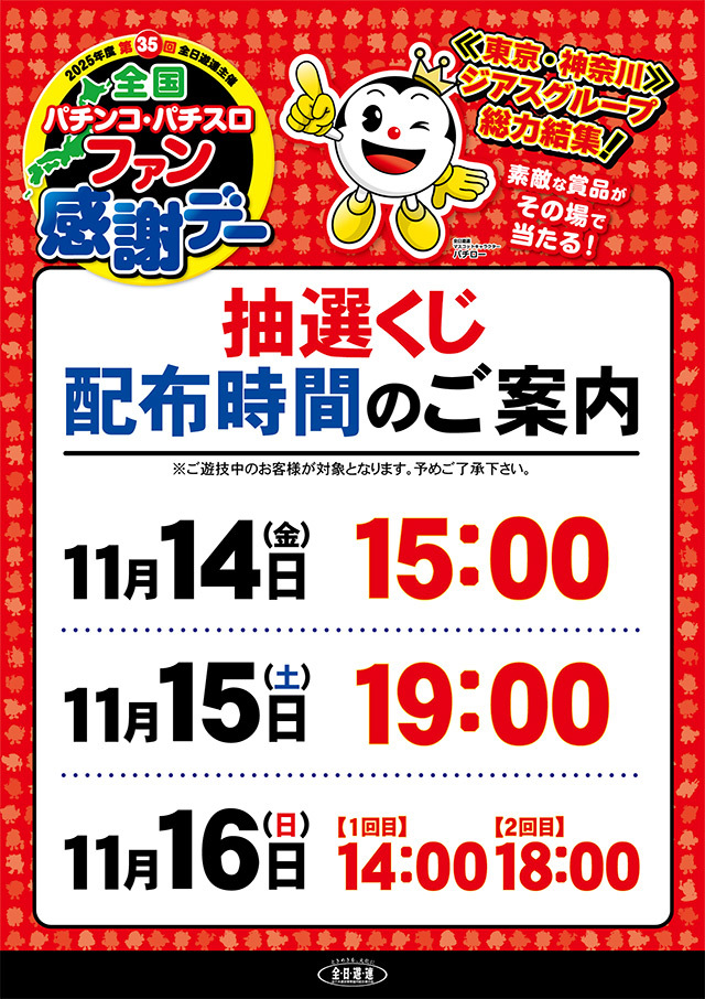 本日は ✨✨✨✨✨✨✨ 第35回 全国パチンコ・パチスロ ファン感謝デー ✨✨✨✨✨✨✨ 🎉最終日🎉 最終日は抽選くじ2回配布です😄 #ファン感謝デー #サガン新横浜 pic.x.com/PGdyqRZaTp