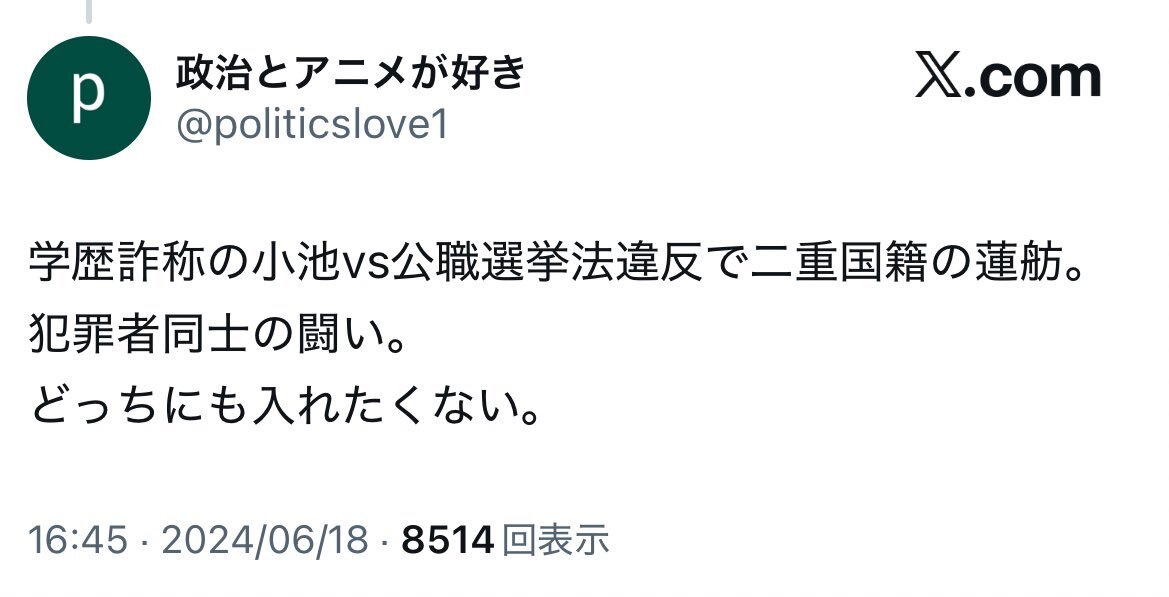 【悲報】推定無罪の原則を持ち出し、起訴された段階で立花孝志を犯罪者よばわりすることを戒めていた@politicslove1 さん、自分は小池知事や蓮舫議員を犯罪者呼ばわりしていたことが判明 #ダブスタも好き x.com/politicslove1/…