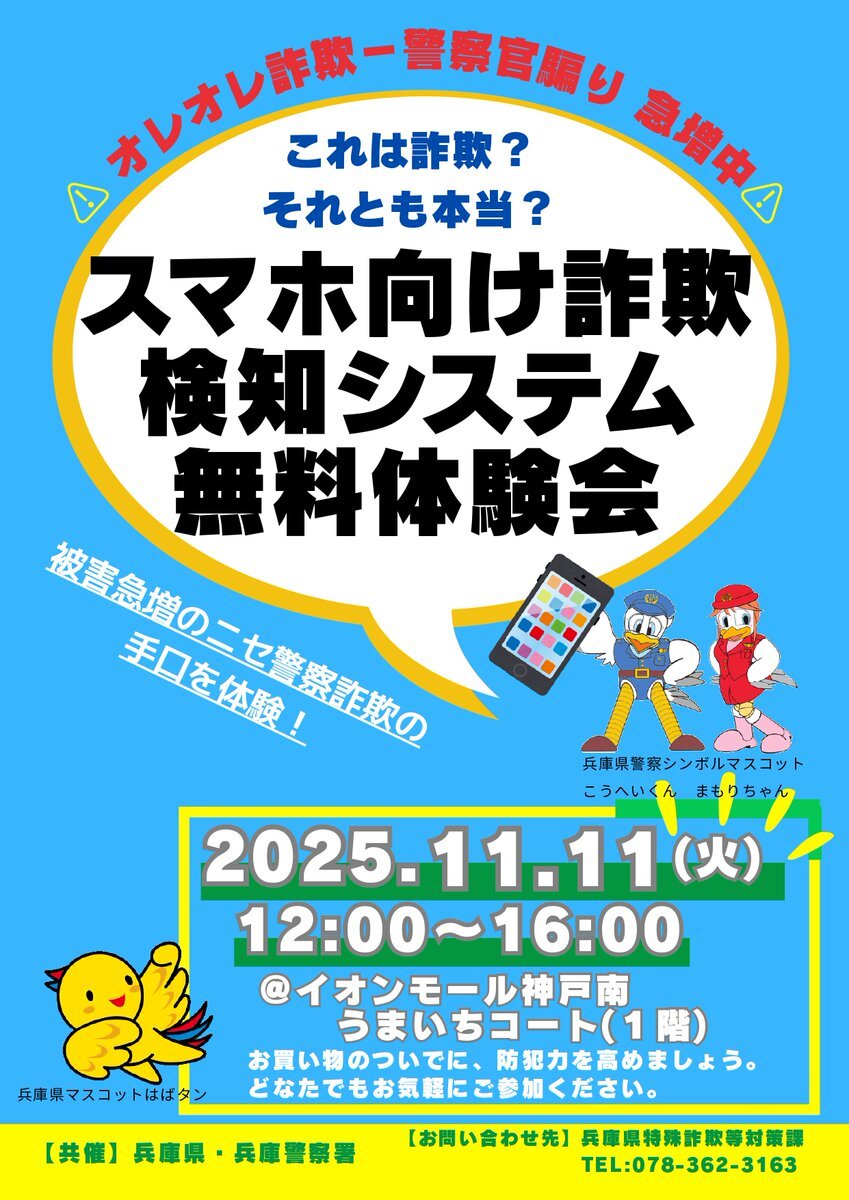 詐欺?本当の話? どこで見分ける?💭 明日、11/11(火)開催 詐欺検知システム無料体験会 詐欺電話がかかってきたことのない方、 詐欺に引っかからない自信がある方、 お買い物の前にぜひお立ち寄りください🛍️ 📆11/11(火)12:00~16:00 📍イオンモール神戸南(神戸市) web.pref.hyogo.lg.jp/kf13/tokusyusa…